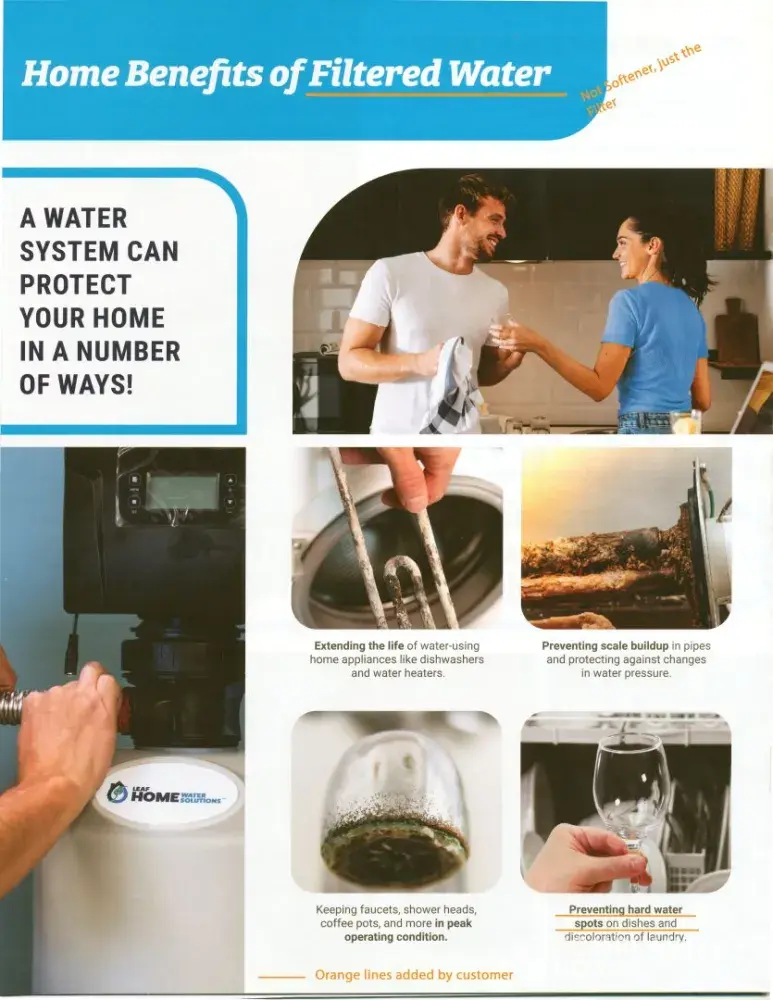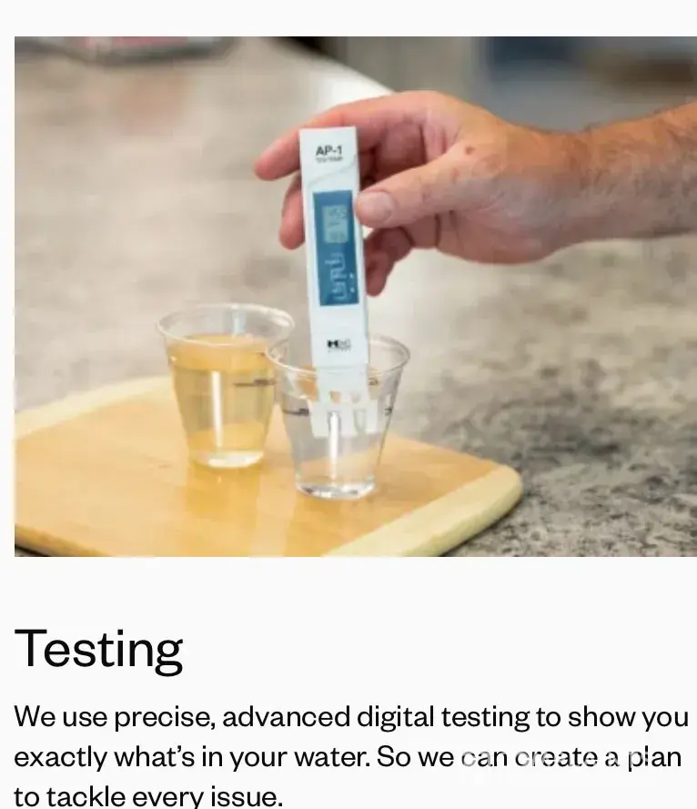 Leaf Home Water Systems sent a 'water expert' to test our water, not the electronic testing they promote. We were sold on a salt-free water filter for our well water, which left us with hard water issues with faucets, coffee pots, satined glassware, and hard water deposits on a brand new deck. Their answer was to revise our system back to a soft water...
