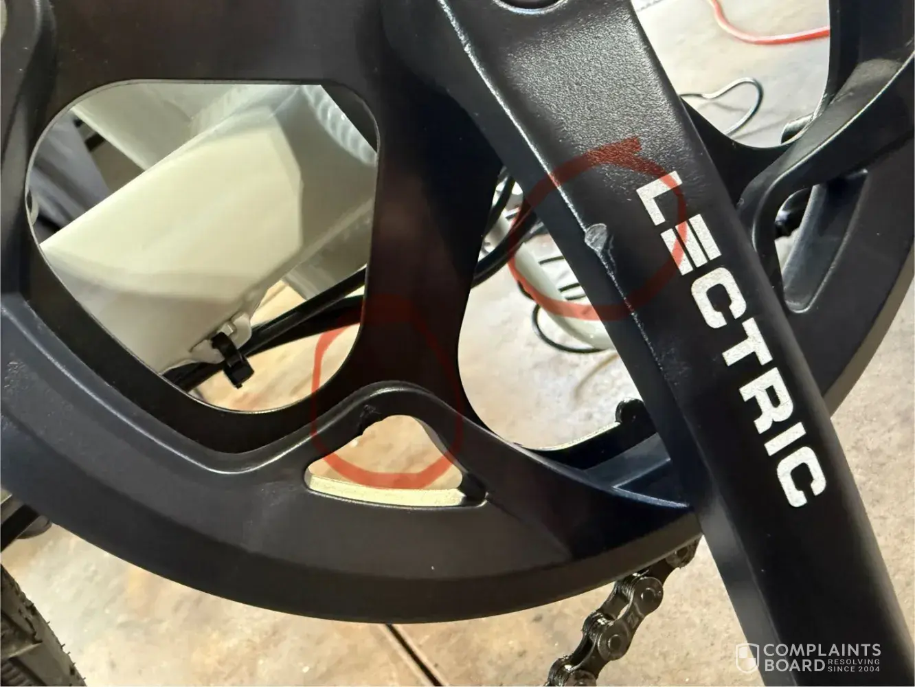 10/3/25. Could this be shipping damage? Step thru white xp4 750. Found a gash on pedal sprocket and another on the pedal shaft on the right side, the sprocket is bent and has a wobble when peddling.and the chain is clicking noise in gears 6-8. This went undetected by seller and ourselves when we purchased 9/26. 1 week ago. Only 34 miles on it.