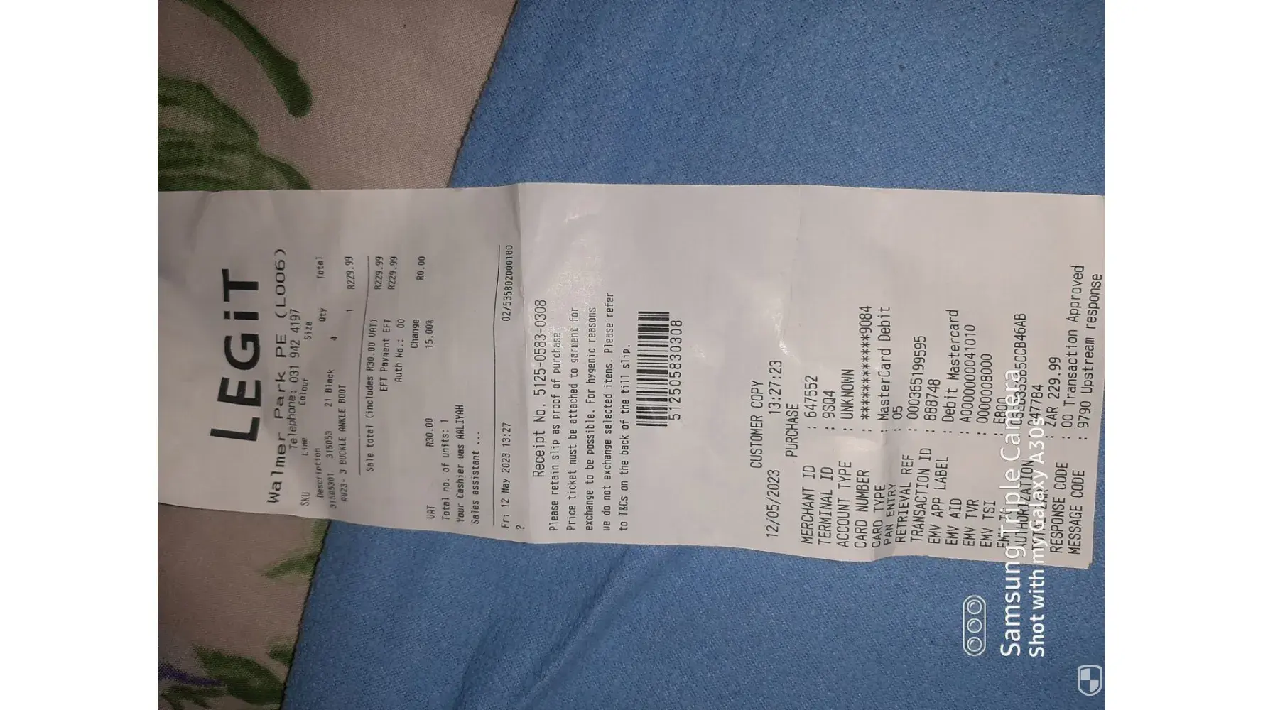 I brought a 3 buckle ankle boot at Legit Walmer Park on Friday 12 of May 2023 at 13:27 . I only worn it 3 times but on the 3rd time i noticed its torn. I am really disappointed. I always buy my shoes at Legit and never had an experience like this.