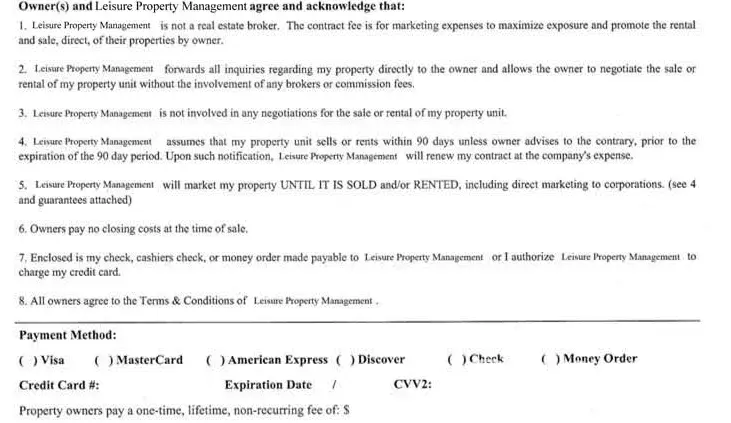 1. Leisure Property Management is not a real estate broker. The contract fee is for marketing expenses to maximize exposure and promote the rental and sale, direct, of their properties by owner.