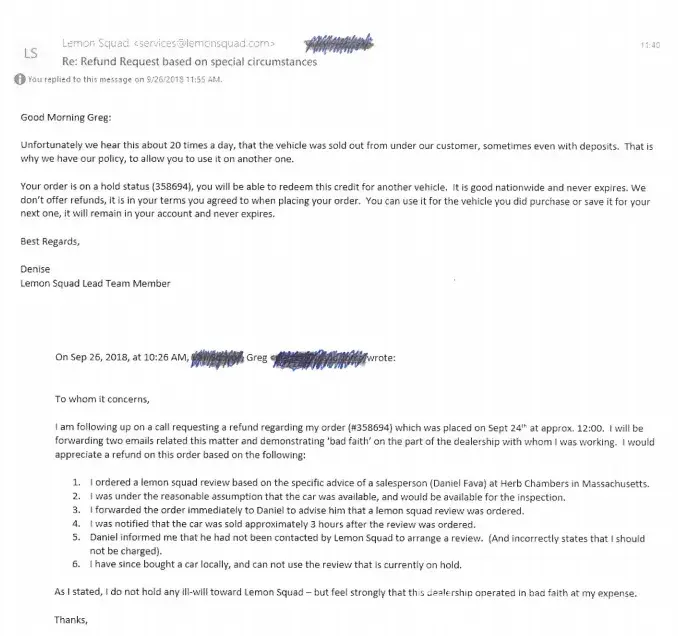 I was looking at an out-of-state car, and paid $149 on Lemonsquad.com for an inspection on Jul-12. Lemon Squad organized the inspection for Jul-15. In the weekend, the dealer sold the car to someone else. So, they could not complete a service for a particular that I requested. The invoice that I have clearly shows the vehicle and the dealer that I requested the service. Now they are refusing to refund me the money, and they say that I can use the funds for another vehicle. However, the issue is that I do not want to use the service anymore at all. Order number 378000