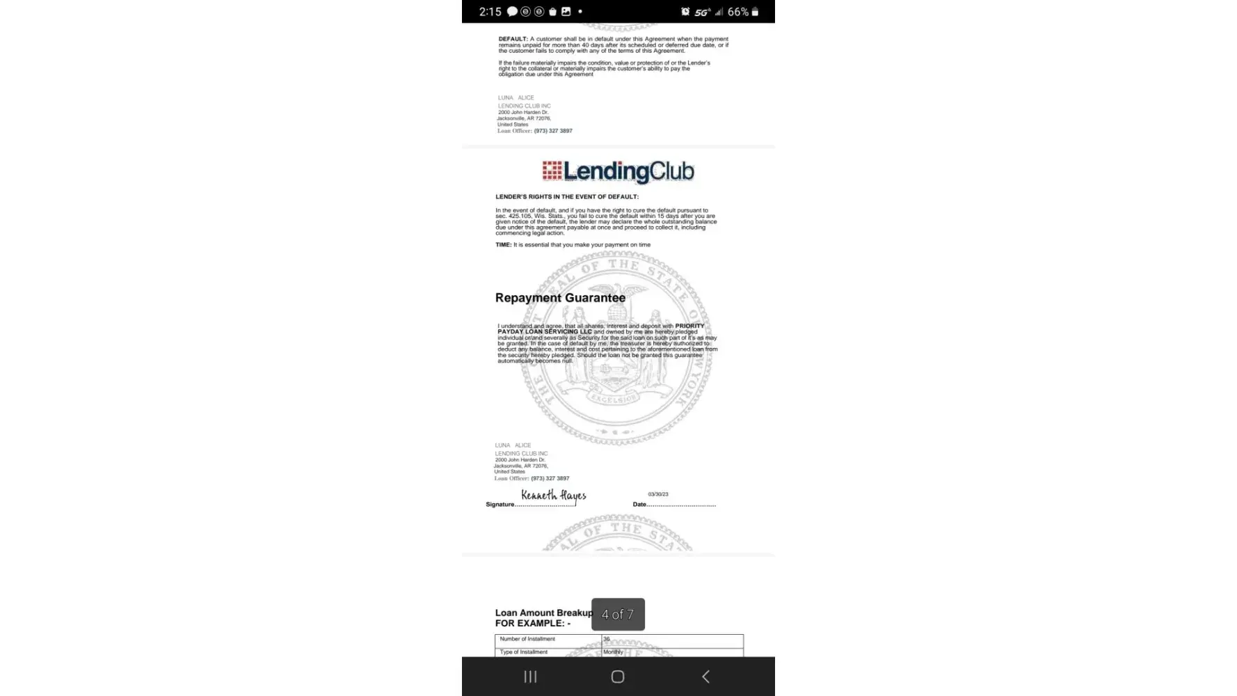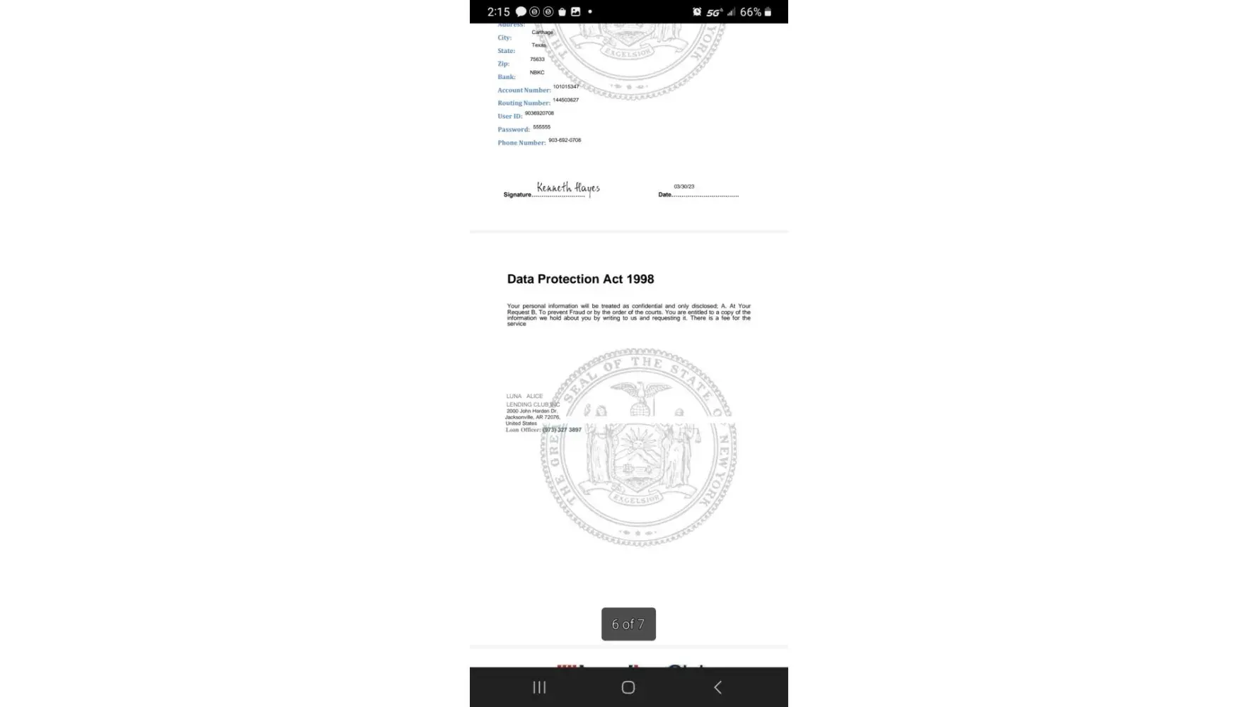 Yes I received a email from lending club that stated my loan went through and for me to go straight to esighn. I sighned my name and dated the documents on 3/30/2023. And it gave me a number and the loan officer's name for me to call after I signed the documents and it has failed to call the number they gave me. And now my esigniture is on the documents that say I got a loan for 5,000 dollars. They have my bank routing number and account number. Now im worried about fraudulent documents that can be used to get money and im liable to pay. What do I do? Already called my bank. But what stops them from using my information to get money from another bank. I know I want restatution for the continuously not me able to sleep for being stressed someone is using my creditials to get loans through other banks. Who's liable for the stress this has put me in. Someone