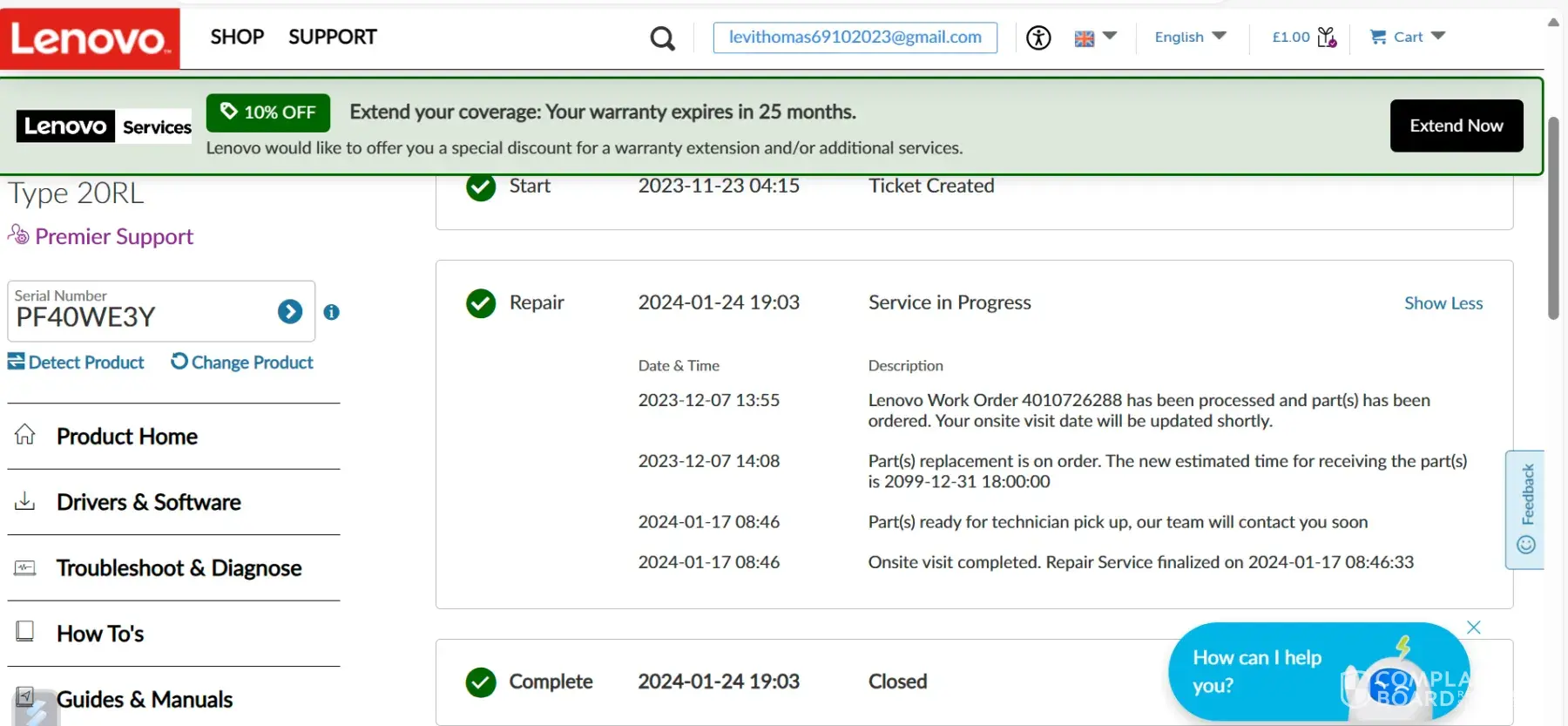After a few days, I received an email stating that my ticket had been closed, with no resolution. I was shocked and frustrated. I went to the support page to check on the status of my ticket, only to discover that they had changed their login procedure. It took me a while to finally get through and find the page with my ticket on it. To my dismay, I discovered that Lenovo had closed my ticket because the laptop was out of warranty. I was under the impression that my extended warranty had been updated, but it turned out that it wouldn't start for another two weeks.