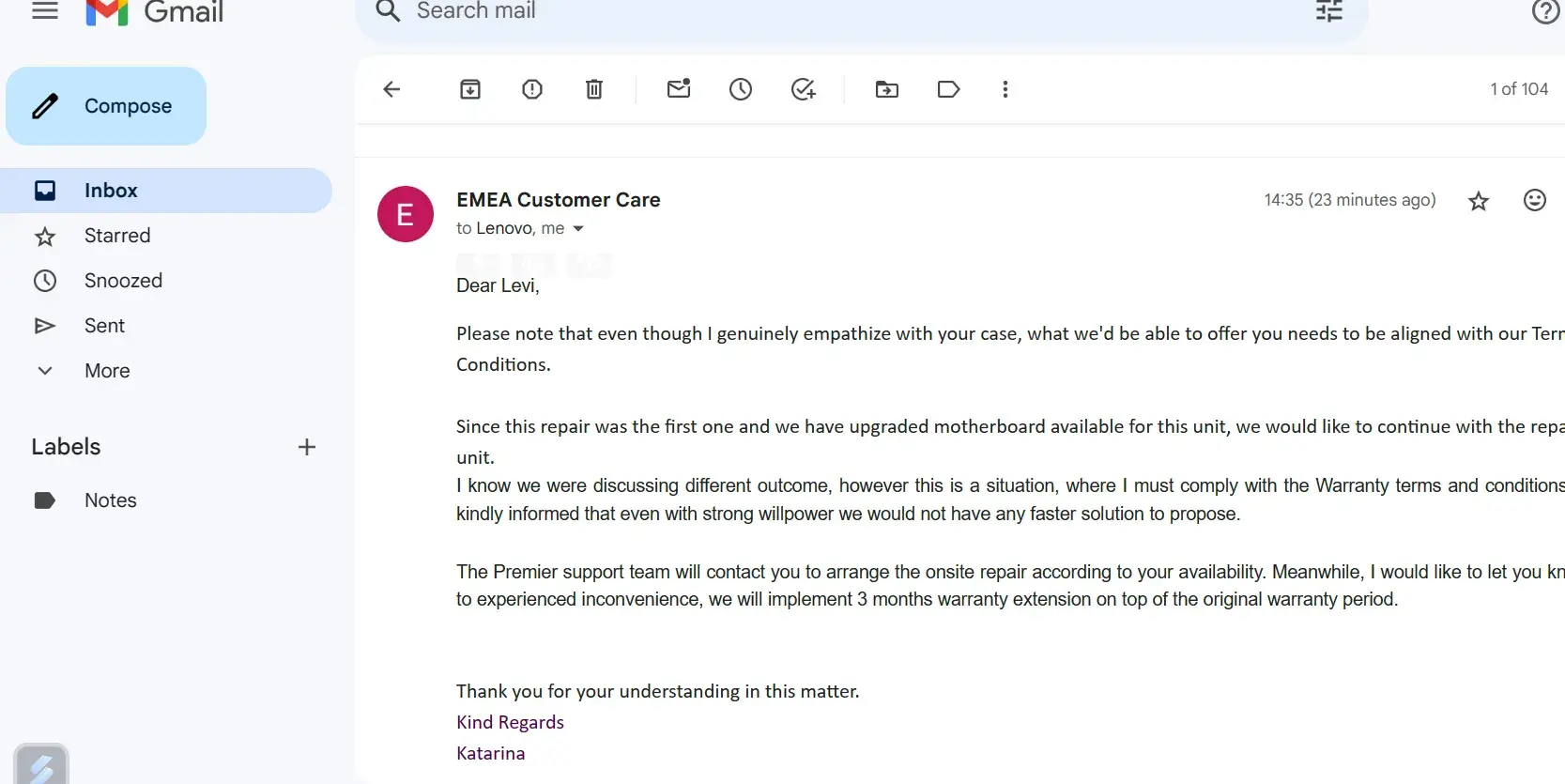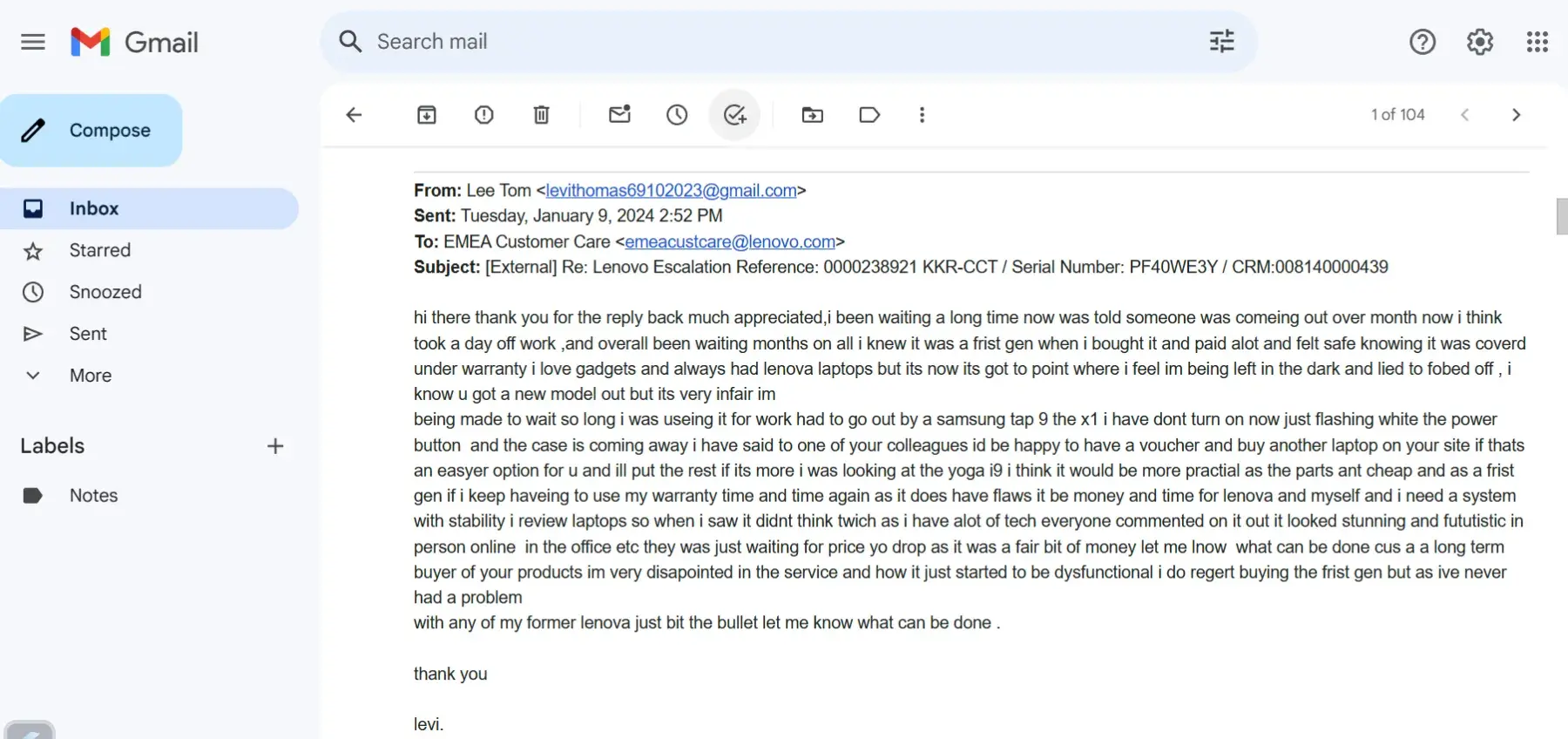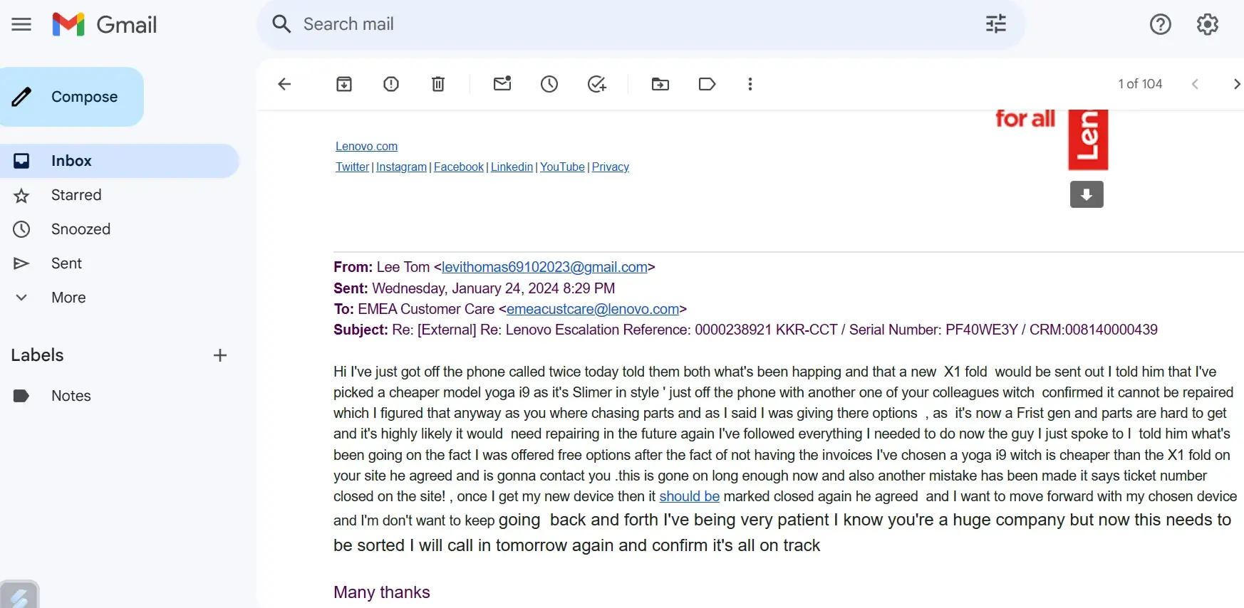 I complaint that Lenovo has failed to settle this case with the customer since I reported the broken hinge problem on 8 Oct 2023. This was the date long before the warranty expired. From 6 Jul 2024 to 12 May 2025, I had received 12 replies on Lenovo Case 2015683305 that were sent by Maggie Luk. She is the CX Case Manager, Customer Care Center, AP Service...