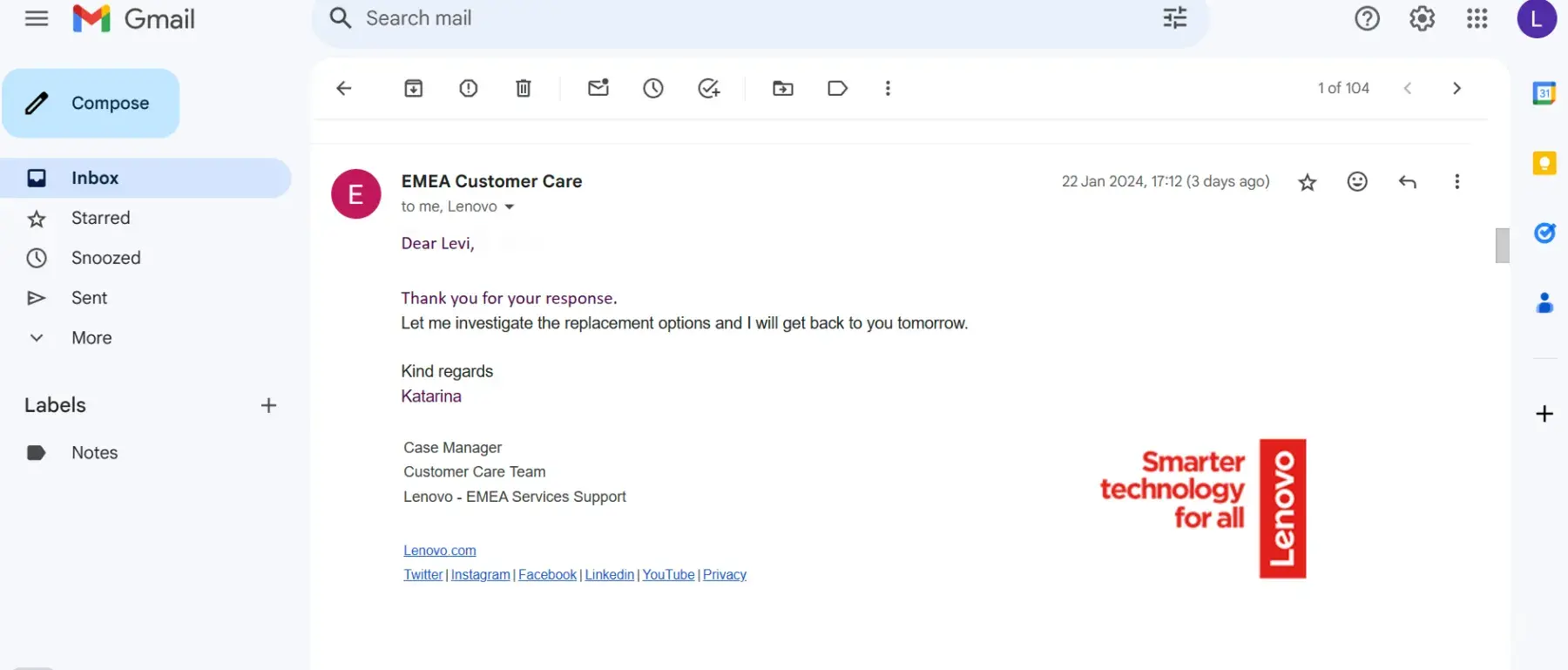 As I attempted to install and load the replacement, MAJOR CHALLNGES. Because the broken machine had all my data on it, very seriously private data from clients, as I attempted multiple times to use the Lenovo app for migration, the blue-screen came up several times. I attempted to get support from Nikolaus to resolve and he was really no help but keep insisting very directly and rude that I must send the broken unit back within 10 days. I told him I was unable to send it back until I retrieved all my data from it. After much argument, he extended the return shipment a few days to January 20, 2024, today's date.