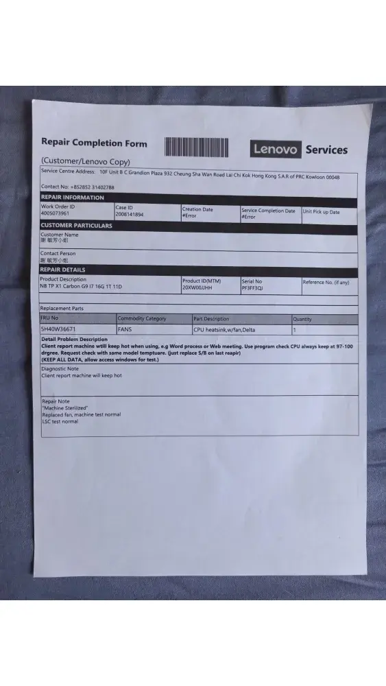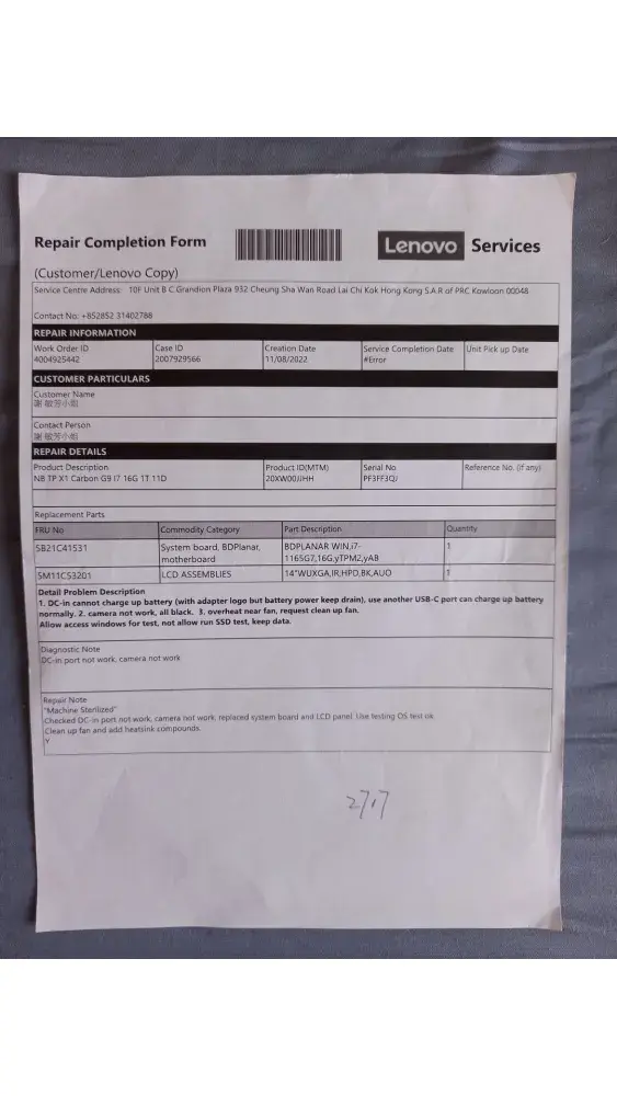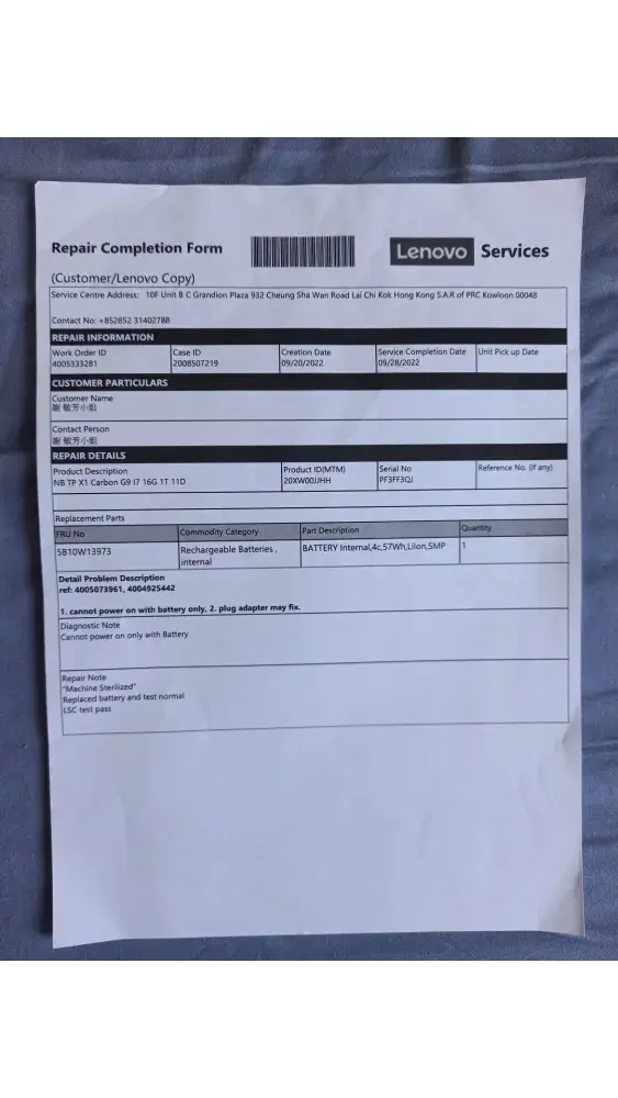 I got another phone call on 26/27 September and that staff claimed that they would do the follow-up. He said that his teammates would contact me again and handled the case. Yet, I did not get any calls, messages or email. The repair centre just sent an SMS to inform me to get back the laptop. It claimed that they fixed the computer. From the report, it showed that the centre had replaced the battery. In these two days, I followed the instructions and downloaded the Lenovo Bios. Yet, whenever I turn on the laptop, I have to wait for two minutes and wait for the device to show me the login page. It is absolutely unacceptable for a company to introduce a product in such poor quality to the market. And Lenovo service is a disaster!