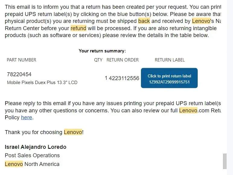 On 4/12/23, I received the replacement laptop, but unfortunately, I spent hours setting it up only to find out that the touchpad did not exist. I immediately contacted Lenovo to request a laptop that actually works. On 4/24/23, a service representative emailed me and informed me that a manager would be calling me. However, as of 4/29, I have yet to receive a call from anyone at Lenovo.