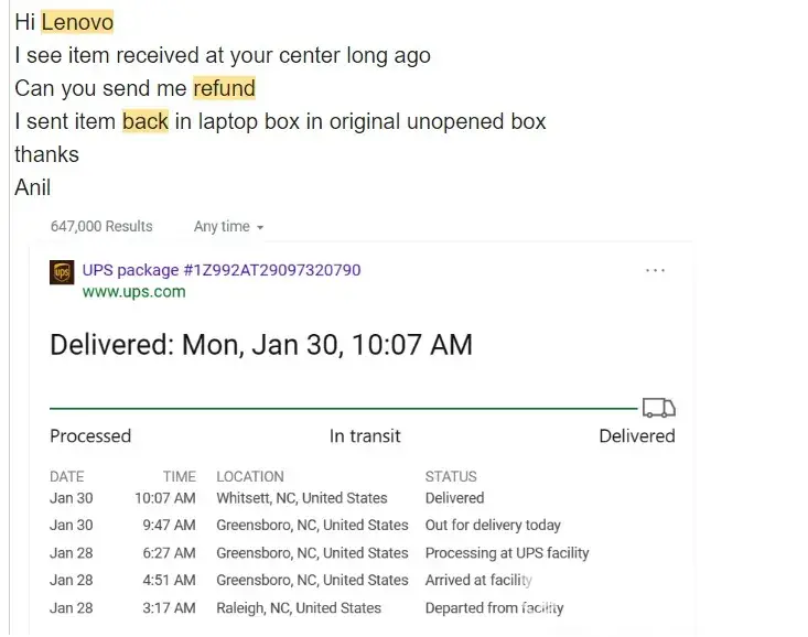 Yes, the package arrived on January 30, I´m contacting the national return center to request the package be located and scanned, then the refund can be processed. This can take 7 to 10 business days since this team is having a high volume of returns