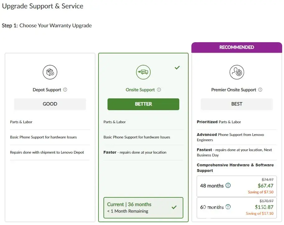 The website only shows me the price for the Recommended option of "Best" Premier Onsite Support. I do not want that option -- I want to extend my warranty at the current level, but none of your sales people can find a price for that!