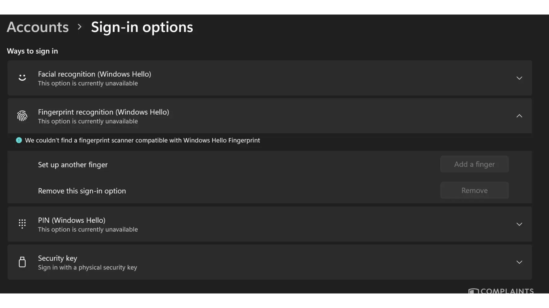 However, my machine recently updated, and is now saying that 'a fingerprint scanner compatible with Windows Hello Fingerprint' cannot be found (see attached screenshot). My laptop has a fingerprint scanner which, up until it underwent these updates, was working just fine. In fact, it was one of the primary reasons I chose this machine. Why is the fingerprint sign-in option suddenly unavailable? Is this permanent? Currently, the only 'available' sign-in option is a security key, which I very nearly couldn't remember, meaning I was almost locked out of my device!
