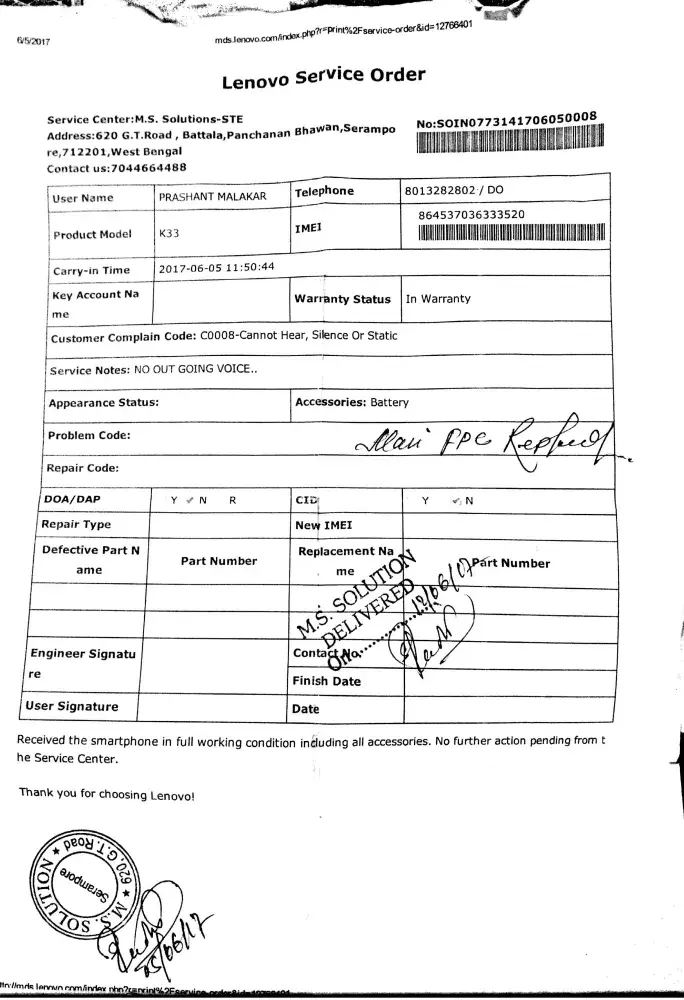 I have purchased a lenovo k6 power mobile on 21/05/2017. From beginning i am facing a proble like "no out going voice". As i was not in my house for my job purpose so, i have made an complaint to my retailer after 12 days and he took my phone and submitted to service centre -m.S solution-ste, serampore, hooghly on 05-06-2017.The service centre returned my phone on 12-06-2017 as "fpc replaced".