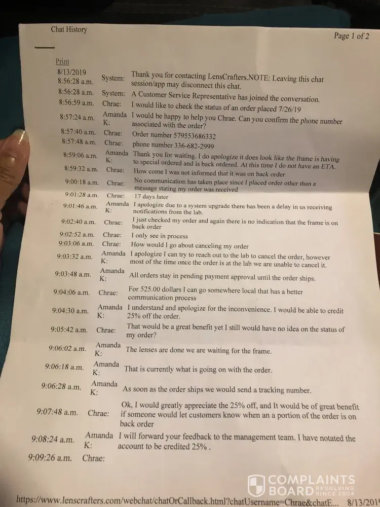 I placed an order on 7/26/19 online at 3:37 pm, order number [protected]. I received an email from mysupport requesting a valid prescription from my doctor to further process order on 7/30/19. I faxed my prescription to 513-492-6454 that day (which I have a copy of that is time stamped). 3 weeks passed and there was no communication from lens crafters on the status of my order. I opted to do a live chat on 8/13/19 where I inquired about the status of my order (which I have a copy of the chat history). I was told by Amanda K that my frame was on back order and she could not tell me when to expect my sunglasses yet she offered to give me a 25% discount. I appreciated and accepted her offer although I was still disappointed that no communication had taken place. I then check my order 3 days later online and it stated that my order was still in process and instock, which contradicts what I was told about my frame being out of stock. I was still hopeful that I would soon receive my sunglasses and today I received email saying my order was canceled in which I didn't cancel. This whole experience has been stressful and disappointing. I would like to know what is going on behind the scene with Lens Crafters