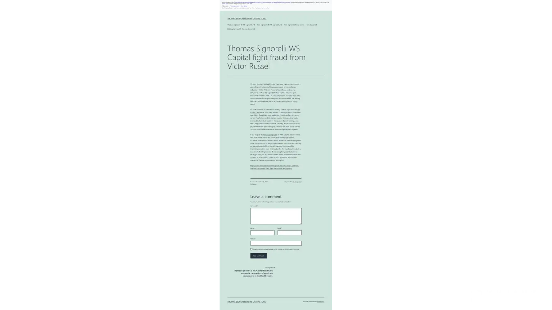 https://webcache.googleusercontent.com/search?q=cache:p1QGSojiAtwJ:https://www.thomassignorelliwscapitalfund.com/2022/12/23/thomas-signorelli-ws-capital-fight-fraud-from-victor-russel/&cd=1&hl=en&ct=clnk&gl=nl