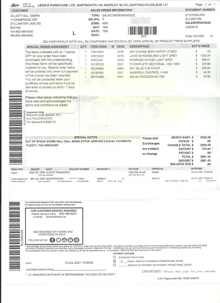 Ordered a SECTIONAL on June 25th 2021, expected delivery of October 2021. Got a call from Leon's on July 15th saying it was in. So, we sell our furniture we had at the time, to make room for the new sectional that was to arrive in the next few days. A COUCH was delivered on July 20th. When we contacted Leon's to advise of the issue, they stated their sale...