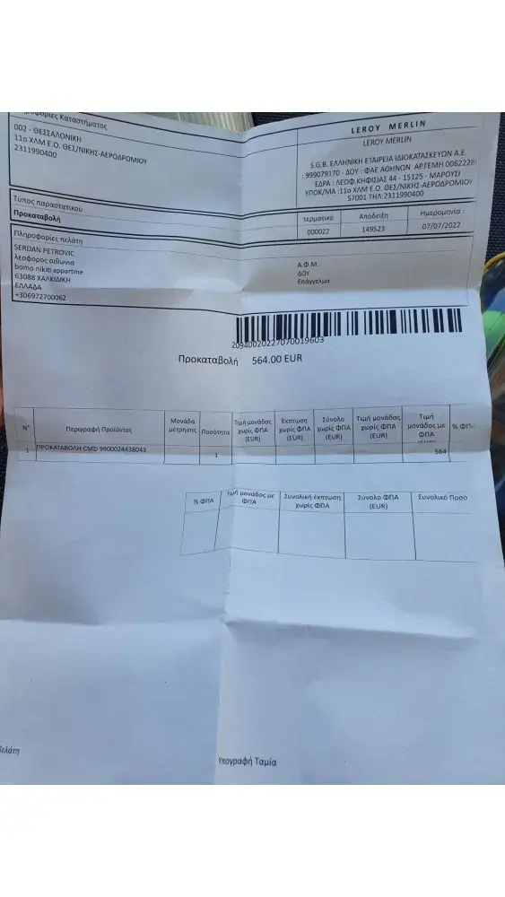on 9.7.2022 we have bought two balcony awnings from Thessaloniki shop. First was OK .But the second one miss the crucial part (seal holde on picture attached). I can suggest to Leroy Merlin send to us in Nikiti the missing part together with shipment planning to deliver on Tuesday 12.7. 22 in Nikiti. will send the payed order confirmation.