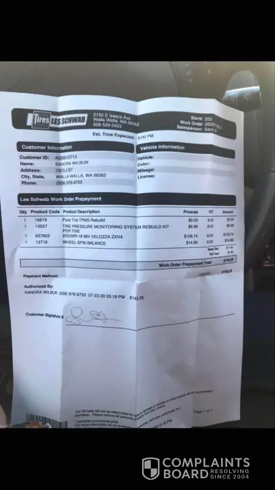 I recently purchased 4 brand new tires at les schwab in spanaway, wa. Unannounced to me these are bigger tires, I noticed my vehicle wasn't shifting into 3rd or 4th gears, its a automatic. I took it back to les schwab and spoke with the manager sean, he acted like he had no idea what happened?? Then I took it to the dealership, $175 later, they gave me a...