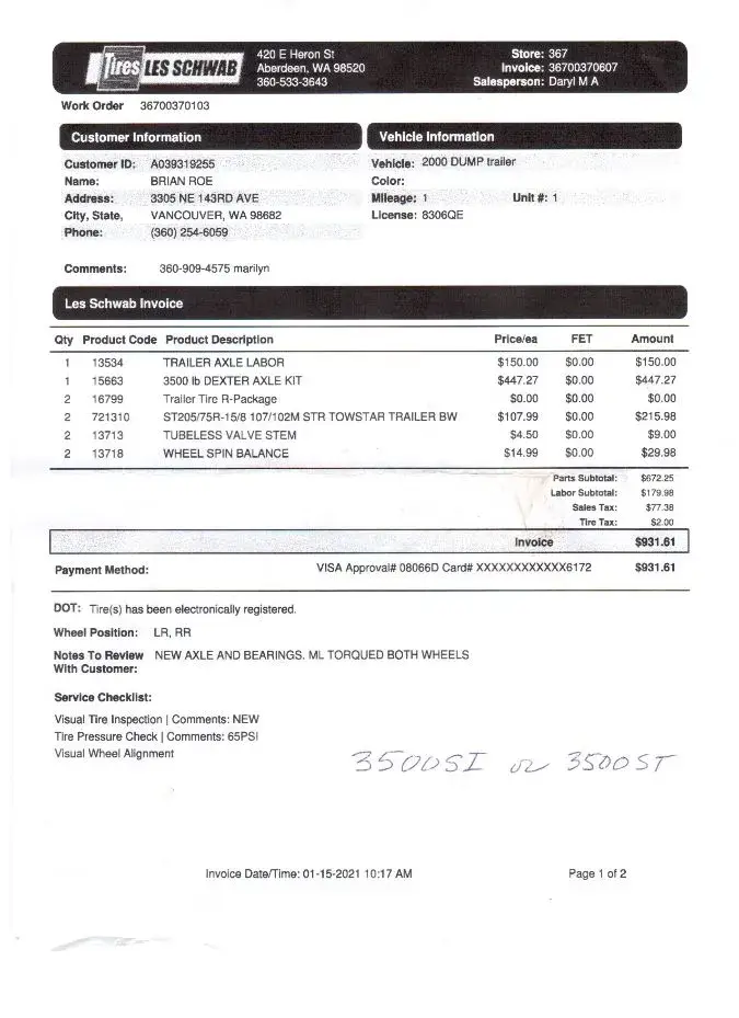 Incident Date 1/16/21, left trailer at Les Schwab Tire Center, 420 E Heron St, Aberdeen, WA Name: Brian & Marilyn Roe Customer #A039319255 Work Order #[protected] Iron Eagle Utility Trailer We stopped at a store in Aberdeen, Washington when we noticed a bearings was bad on one wheel of our trailer. We were relieved to find a Les Schwab only a couple...