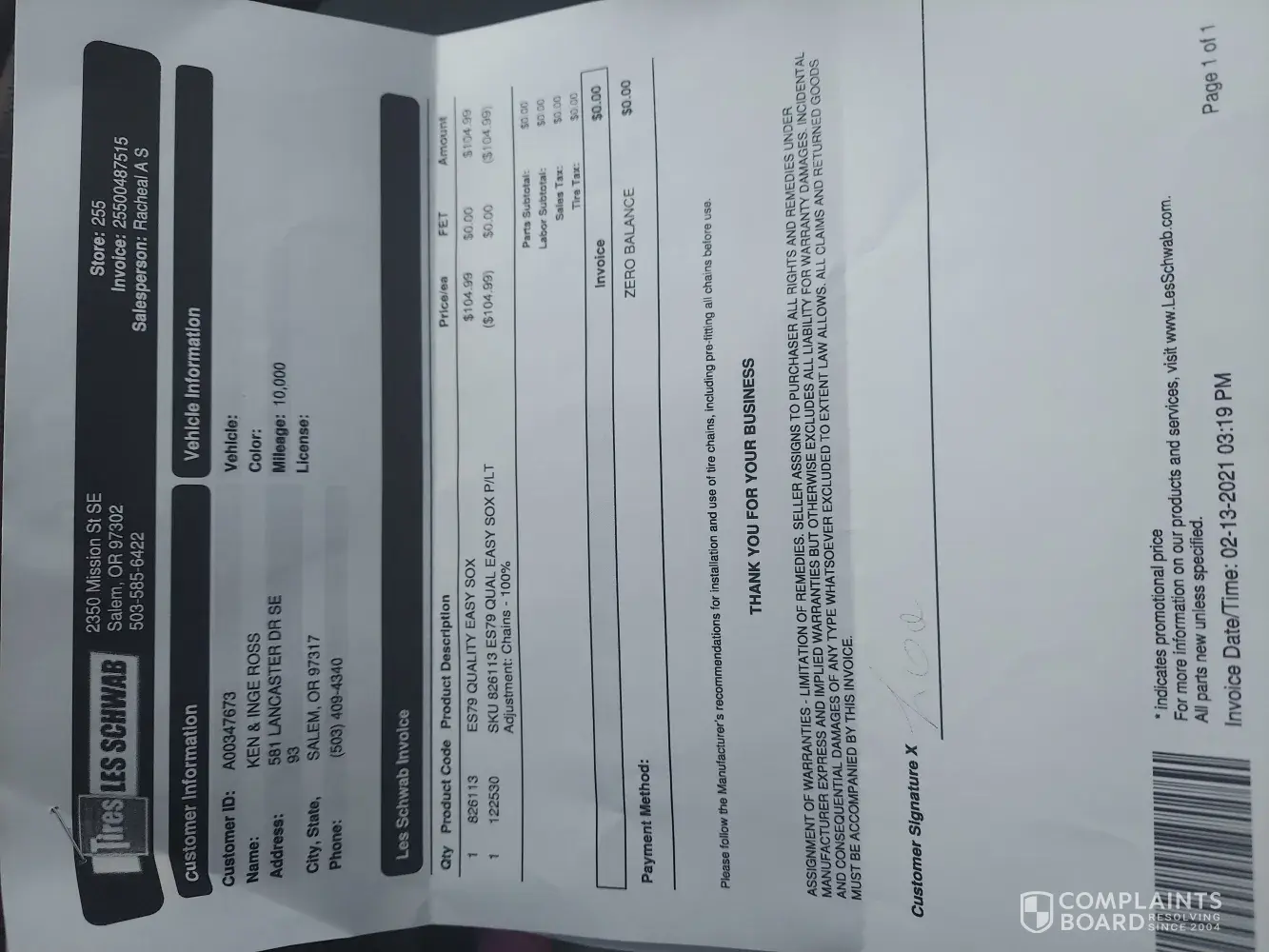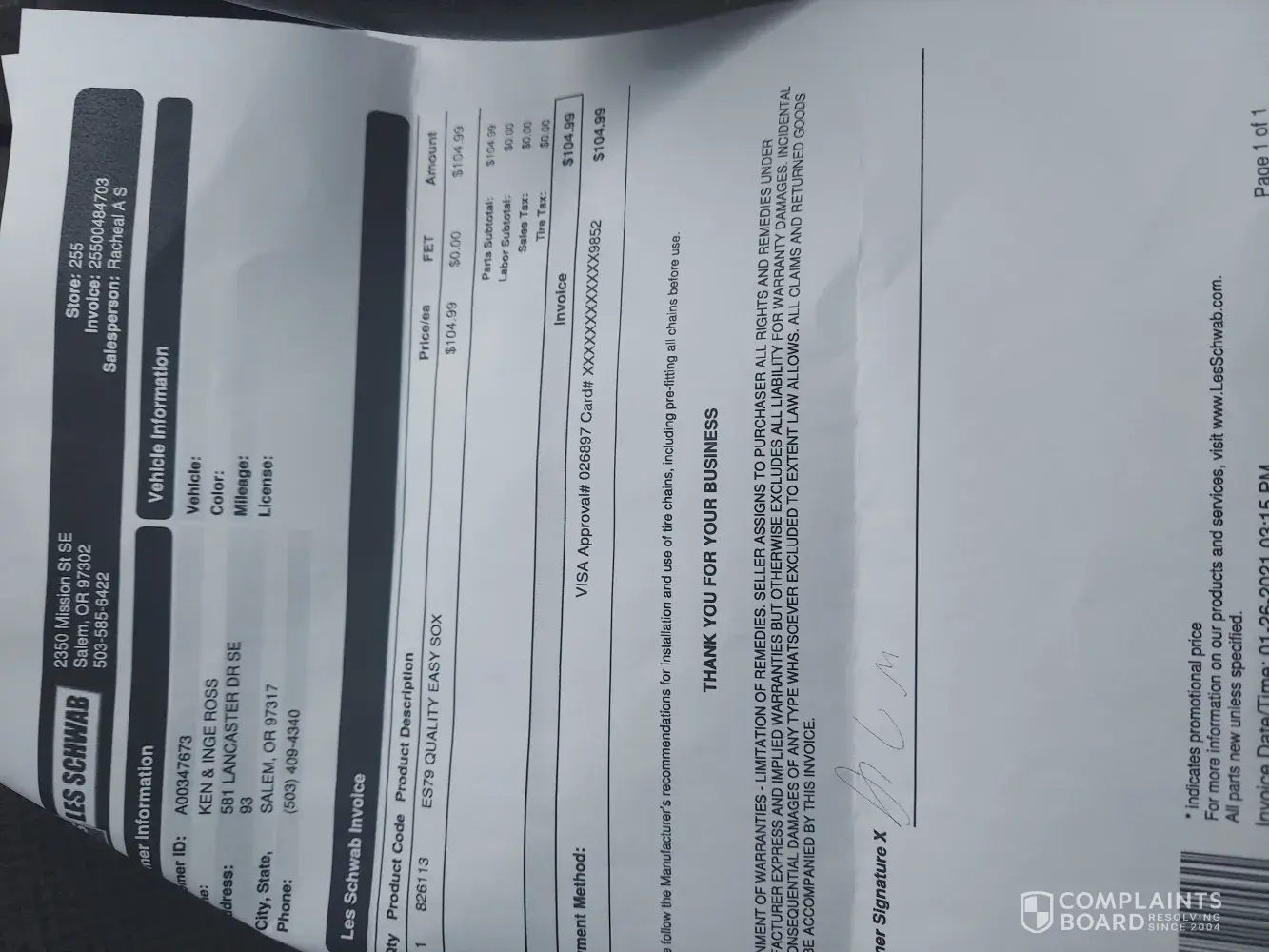 I recently had work done at the Ontario, OR Les Schwab Tire Center and my complaint is charging me $50.00 a wheel for mount and balance. This was a complete shock to me as this has not been the case in the past and I was told that the policy just changed on this due to internet sales. What is frustrating is that if I had bought the tires from Les Schwab...