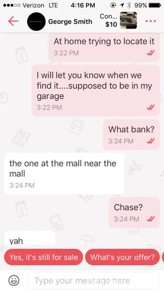 I want to report a suspicious and potentially dangerous encounter that I experienced with a Letgo customer. A person named George Smith contacted me today 11/20/18 regarding buying a product I was selling. He wanted to meet at a bank near our local mall in the mid afternoon. That sounded safe enough for me. When I asked what he was driving he told me a Grand Prix. He then switched and said he was in a white GMAC truck which we spotted in the parking lot. As we approached the woman in the GMAC truck she thought that we were "George Smith". I wasn't alarmed at first because I thought he simply was buying two products and that he was meeting us both at the same time. Then the woman told us that George told her that he would be in a black Enclave which is what we told him we were driving. He managed to get us both there then told us to approach his car. It was very concerning to both the other woman and us (me and my husband). We left promptly and told him that there was a mix up and that we were not interested. He then said that he was there in a black Enclave. I told him that I was submitting a report and he was concerned that it was to the police.