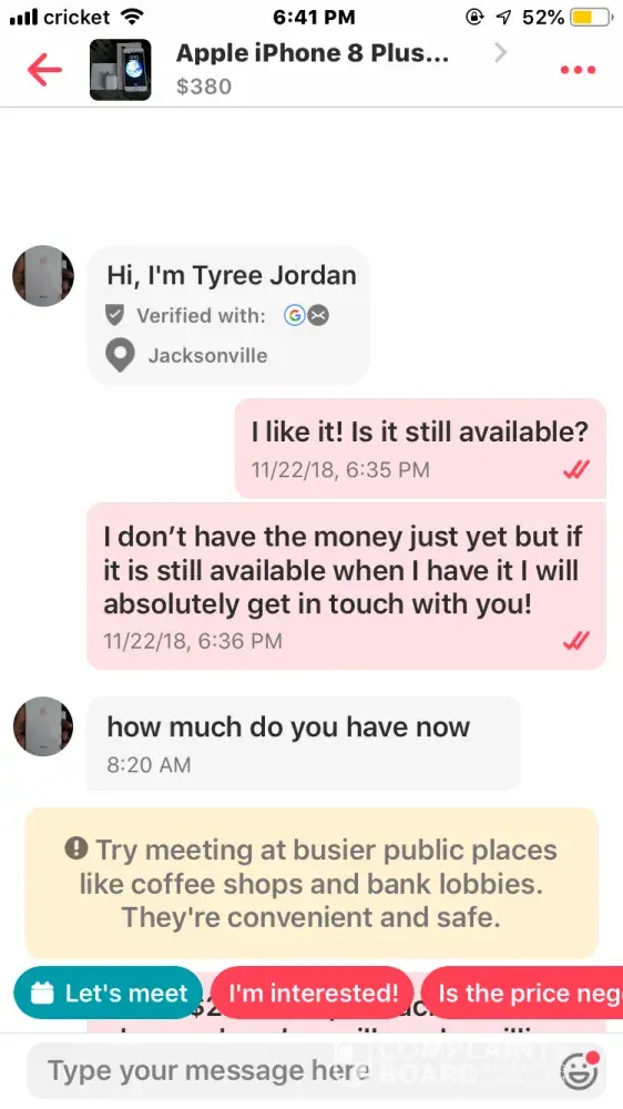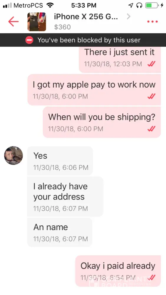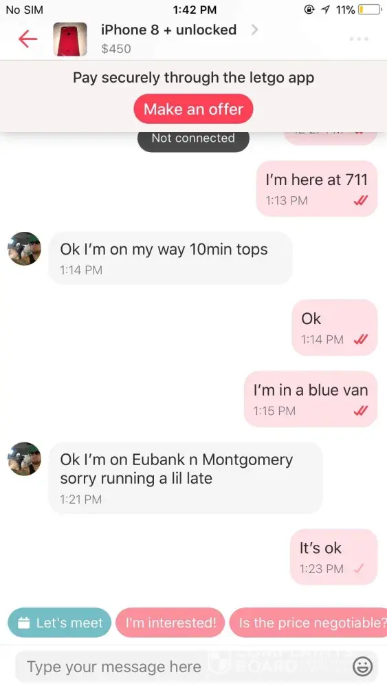 So i was shopping on the letgo app acouple of days ago looking for a new phone. I ran up this this guy named "eric brown" so we were chatting about the phone and the details of shipping so he told methat it will arrive today at December 3 at 1 oclock and i didnt get no package so i try texting him on imessage and on letgo but he blocked me on both apps so i think this guy has been scammin many people and he scammed me like wow he was very good and it was my first time shopping on letgo so i dont know how it really works and im just tryna get my money back.. thank you