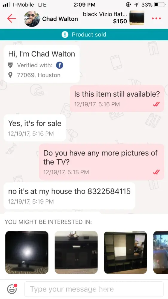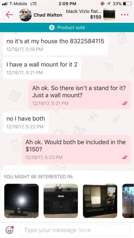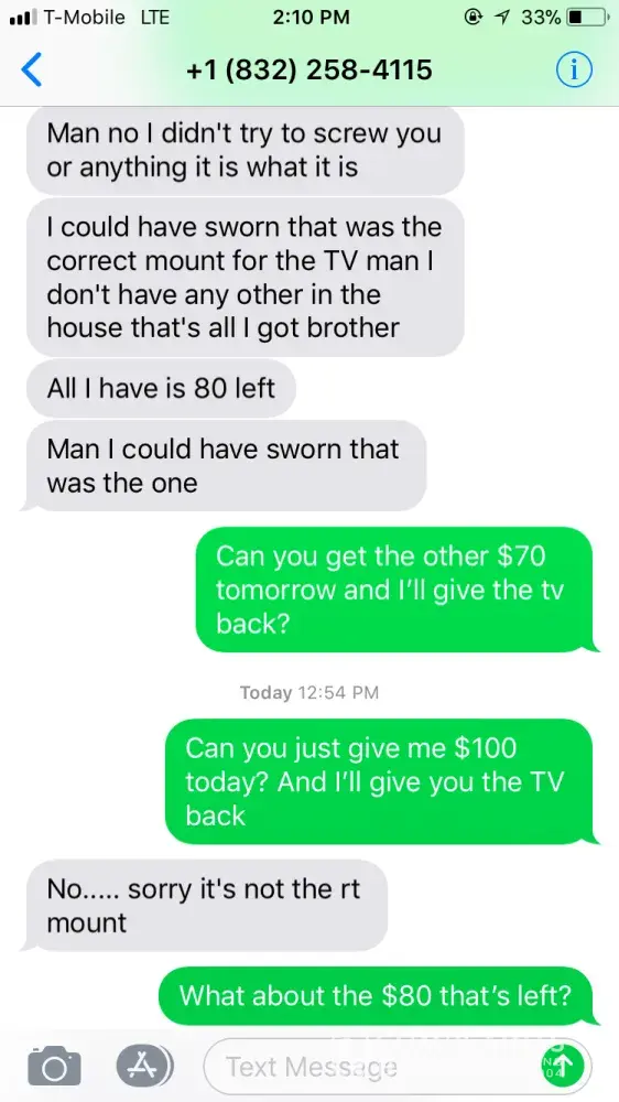 Chad sold me a TV with a wall mount and a stand that go with the TV but the stand doesn't fit the TV, I just want my $150 back. I've even offered to take $100, if he would just take the TV back. After I messaged him about the stand not fitting, he claims that he didn't try to screw me and that "it is what it is" I also can't use the wall mount. I'm sure the TV works fine.