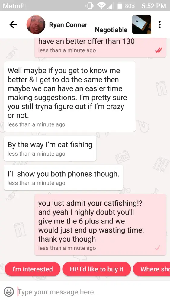 I saw a post from Ryan Conner for an iPhone 6 plus. He is catfishing, I don't know how many other people, but I'm afraid for them and myself. So I didn't go, he admit he is a catfish with fake profile picture. He kept saying I look like a crazy person. So you guys need to watch out for these people. He wasted my time and effort. And it is not acceptable.