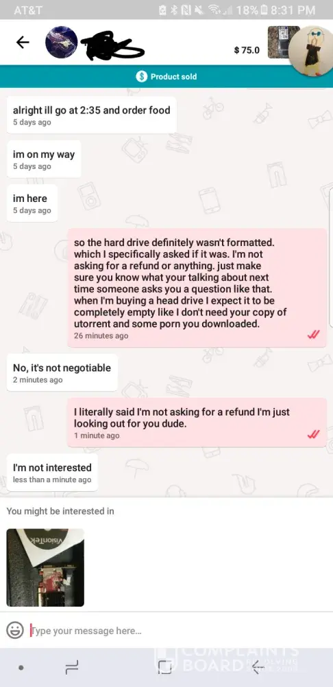 So I bought an ssd that the seller assured me was formatted. I went to do a clean Windows install only yo have it boot directly into Windows. It opens up to this kids desktop. Which has the usuals you'd expect Minecraft, steam, utorrent, and a PORN folder. And a not well hidden one at that. So I formatted it and went on with my day. I figured I should tell the kid so he knows for next time so he's not selling hardware with personal data on it. So I sent him a message which may have been a little rude. But least asking for a refund or anything I just figured he should know. He then changes his review of me that was 5 stars to 1 star. Saying I was rude and saying I was lying. He then proceeded to call me a "boonk [censored]" so I blocked him and now I can't review him. So all people see is his side of the story even though I was looking out for him. There was probably no sensitive information on there and I didn't go looking. I literally saw the desktop and Windows pop up when no went to restart so I could format it. I know it was his because there were like thumbnails from selfies he saved to his desktop.