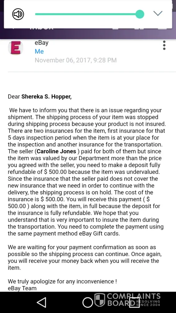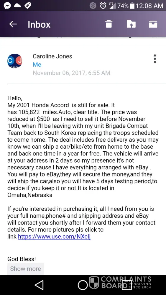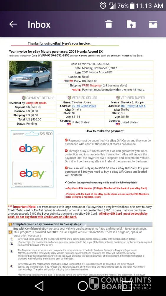Caroline jones pretended to be selling her car due to going over seas for military. I received an email stating her car was for sale and all fees for transportation we're paid. I also informed this buyer that on oct 3rd I lost home and car. I feel then she took advantage of my situation. I did trust the invoice that appeared to be from ebay. I purchased an ebay gift card for $500 and sent pictures of the redemption code. I then received an email that appeared to come from ebay stating it would take 6 hours or less to verify my funds. After 6 hours I emailed "ebay" asking if this was a scam and why I haven't received any shipping info. The reply was I needed to send$500 more for more transportation fees. I knew then I was possibly being scammed. Now the balance of the gift card is zero and caroline or ebay has yet to respond. Leading me more to the fact that I just took my last and someone took advantage of the fact that I informed caroline jones at [protected]@gmail.com that I just lost my home and car due to a house fire that destroyed everything I owned. I'm so hurt and angry that some one used the military and my good heart to just take my money. Ive always heard of scams but this really floored me. Please I need help. This person needs to be stopped immediately.