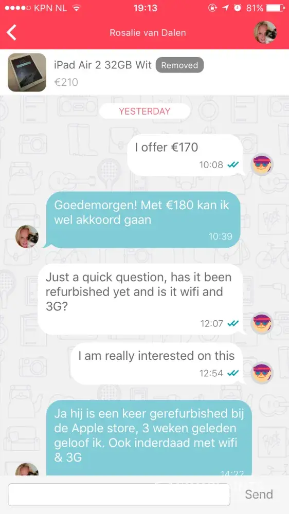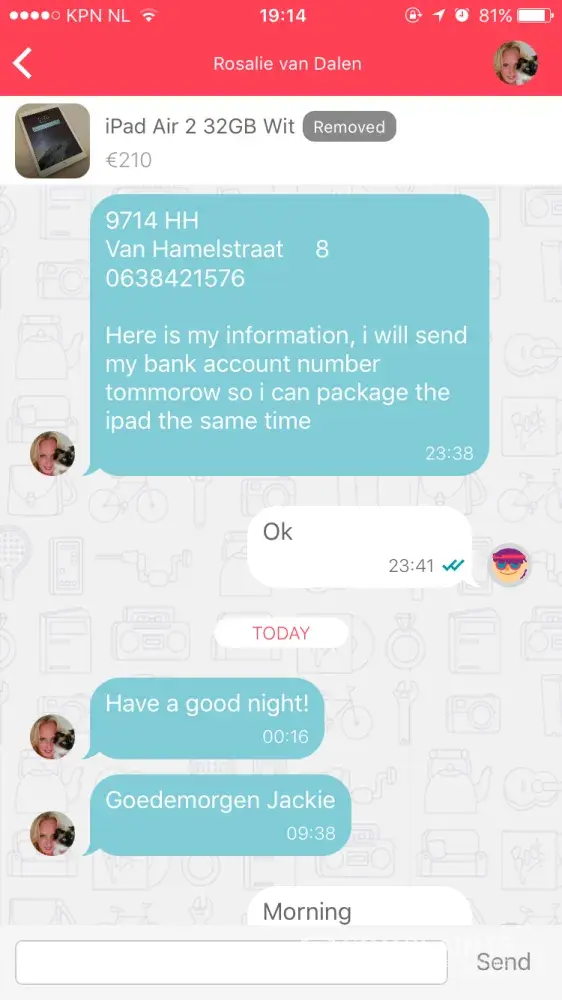 I was scammed by a ms Rosalie van Dalen. She was selling an iPad Air 2 and an iPhone I put in an offer. Emese both agreed to it and she asked me to transfer the money into her account which I did and the last I heard from her she was on her way to send the iPad my way. Ever since she removed the add, her phone is on voicemail and never responds to emails or request for payment. This was on the 18th of September 2017. I went to the police station to file a complaint and was advised to send this complaint.