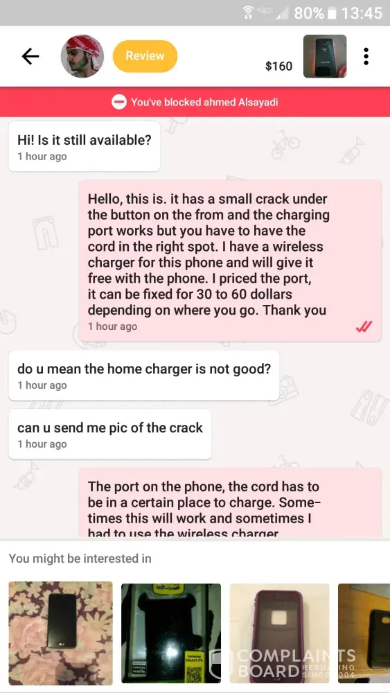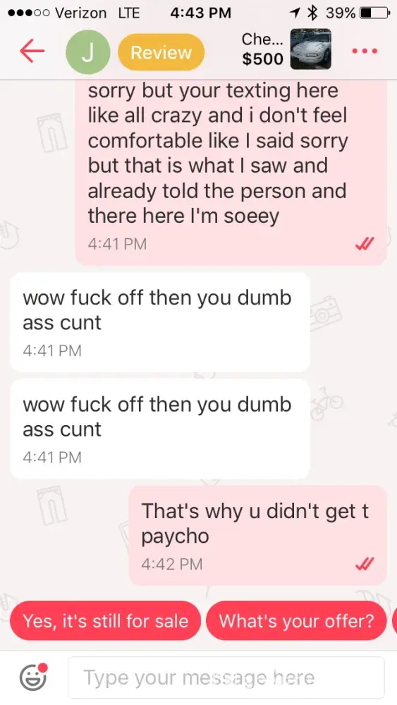 Ahmed Alsayadi contacted me about a product and I did my best to meet his needs for requests of new pictures, which I updated, and questions, which I answered honestly. When it came to a price I felt it was too low and he became ugly. I ended the conversation then immediatly left a review. He propmtly repsonded with more cussing. This is not the first time he was ugly with someone on here according to his review. Please do something about users like this. It makes me not want to use this app and makes me feel uncomfortable about using this app to meet furture people for buying or selling a product. Thank you