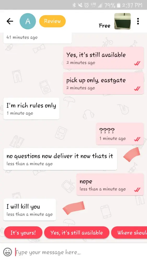 On 8/19/17 someone named Alanee Wright contacted me with interest in a free item I had listed. The conversation was short and they were rude from the get go, which is just something I usually ignore. However, the last statement they made to me was "I will kill you". Now, it's probably a teenager being an idiot, but how am I to know that? I reported them and now 24 hours later I still have not been contacted by letgo customer service in any way. I also contacted them on Twitter that same day as well as the next day and no reply. They do not take the safety of their users very seriously, it seems.