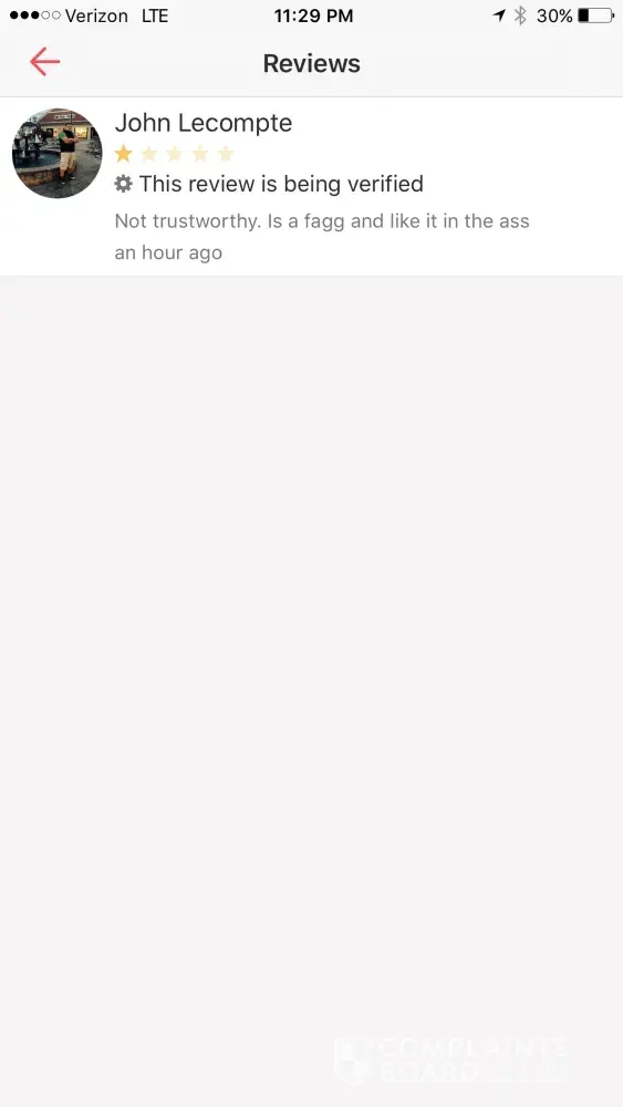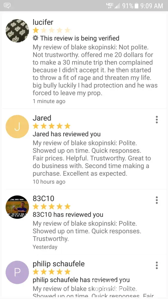 The profile (lucifer), I gave a bad review to because he had not showed up to meeting place for item he agreed to sell me at a specific place and time, and then wanted to ignore me completely for a whole week so I wrote him a bad review. He gets mad and messages me cussing and using extremely vulgar language and then writes me three different false reviews and the last one is the picture attached to this complaint. The review he had given me is completely false I have never met this guy in my life nor did I even threaten him in person or over the phone and I was wondering if you would be able to pull this review from profile (blake skopinski) and delete his account from let go cause i'm not the first person he has written a bad review too just because he got a bad review first.