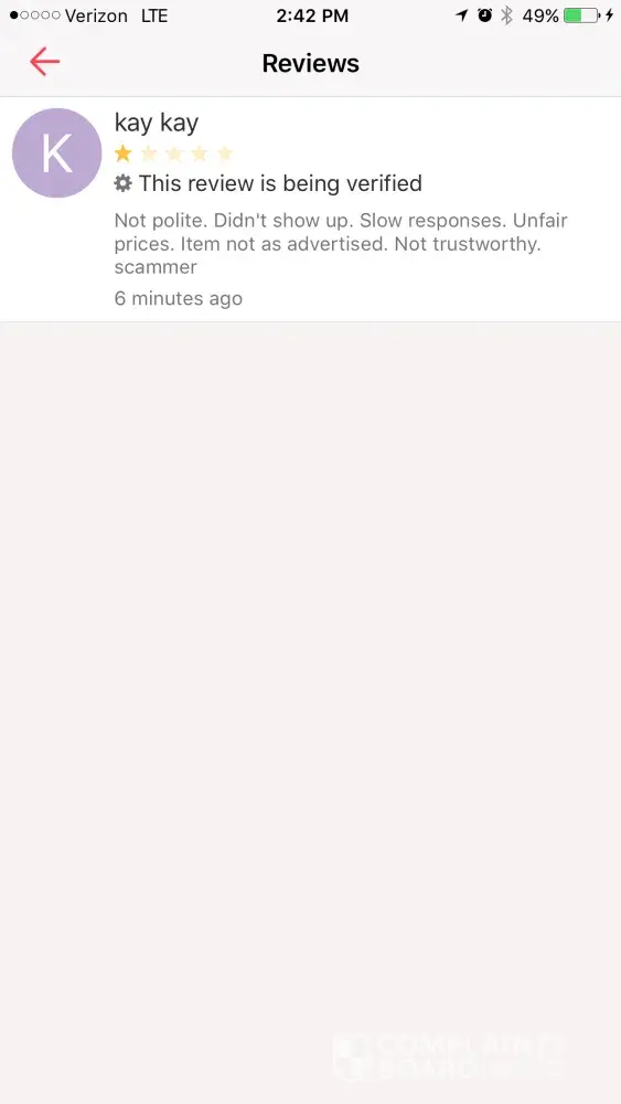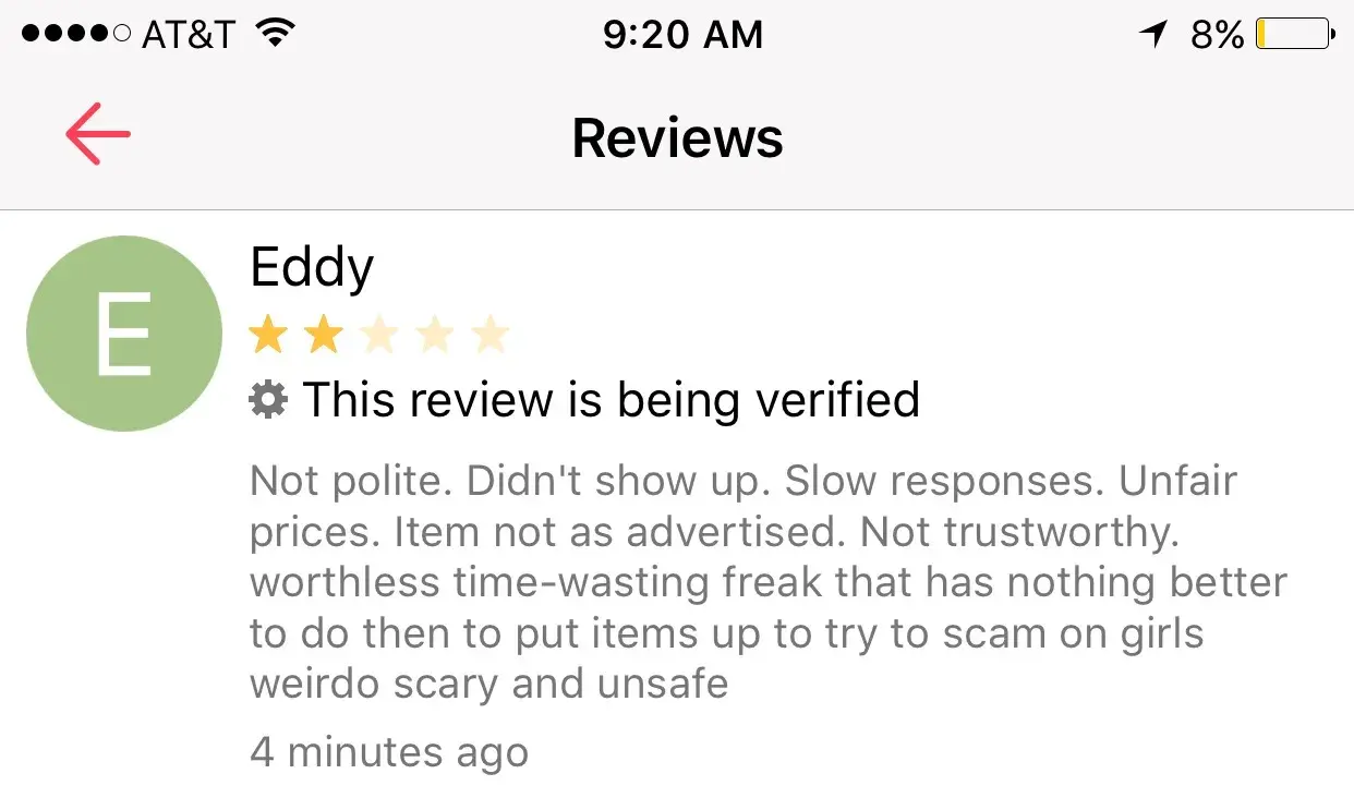 I had received a rude comment -someone saying fake- about some of my stuff that I have for sale and I wrote back saying that obviously it is and I checked her reviews and she's had horrible reviews and so I understand why she is the way she is and that it isn't just to me alone and she turned around and wrote a horrible review about me and lied saying I never showed up to sell something to this imaginary friend of hers. I have nothing but awesome reviews and I'm extremely unhappy with the fact that anyone can just comment reviews about people just because they want to. Please fix this issue!