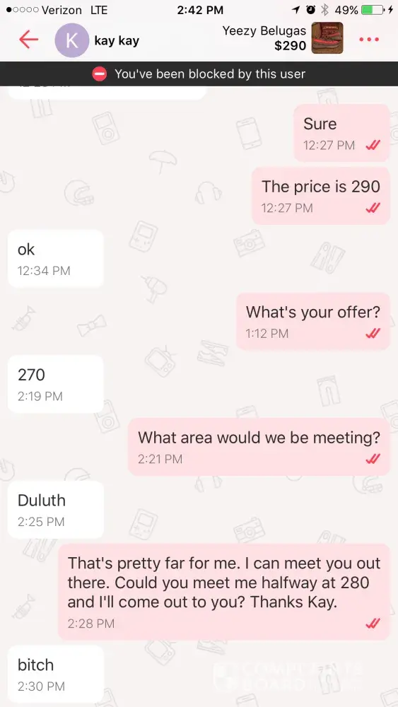 Then the user sent me the message "[censor]" and blocked me. I'm not sure if this was because I asked them to meet me at 280 instead of 270 or why? Please let me know what you can do to help me. I've just started using the app Letgo. My email is [protected]@gmail.com