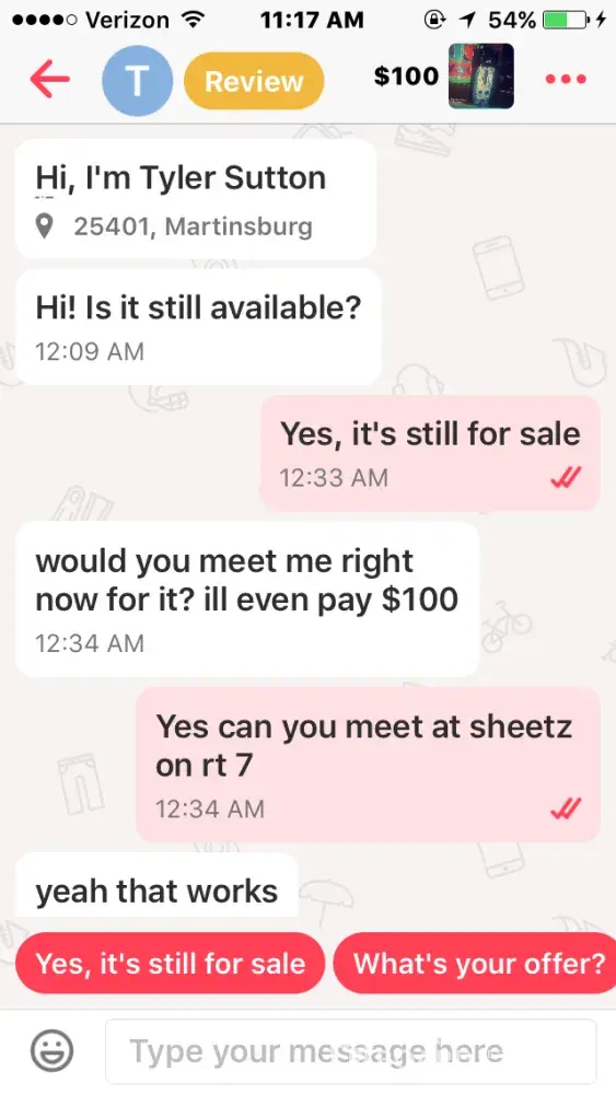 He wanted to meet at 2 am in the morning for the vape mod. He came to my address and he gave me fake $100 dollar bill. He also asked for batteries with it and I gave them to him. So now I would like to have all my chats between me and the user sent to my email and if so an IP address from him or a real identification. Or something so I can track him and get my vape mod back because this is freaking ridiculous. His name was Tyler suttom and he said he was coming from Hagerstown and then he changed it to martinsburg after meeting up with me