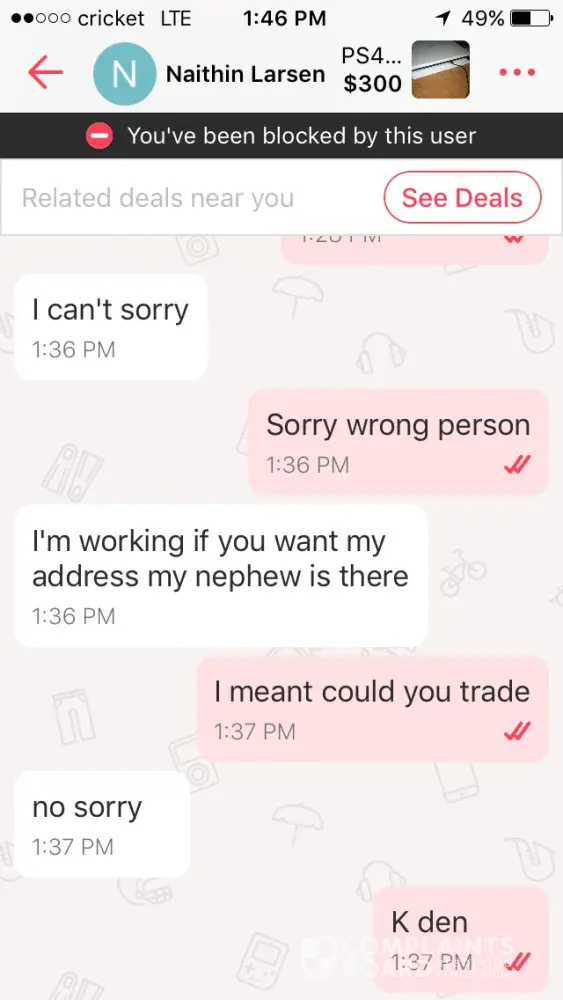 I was contacted about an item I had posted, they showed interest in the item so when they ask for my address I gave it to them because I had just had a yard sale and was trying to get rid of everything a few minutes later they responded saying that they were outside but when I went out side to check they were not there so I told them I did not see them and then they responded in a very disrespectful manner. Then they proceed to block me