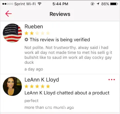 Hello, I have a concern regarding another LetoGo user, as he acted offensively towards me and rated me inaccurately. His name shows as Rueben. I would like to make a note that his profile picture during this incident was a middle finger, which he has now changed to a flag. On July 6th, he initially messaged me regarding interest in a product I was selling. After messaging me in the middle of the night that he would see me in the morning, I responded that I could not meet that one time, since I had work that day. Instead of suggesting another time, he didn't seem to like that, and expressed disinterest in the product, so I happened to sell it to someone else a couple of days later. On July 9th, I was notified that he reviewed me, and I saw that he said offensive and untrue statements, and gave me a 2-star rating. He then blocked me so that I could not rate him back. I was very offended by what he said, and believe it is not accurate or fair for other users to be able to read what he posted about me. Prior to this incident, I have had very positive conversations and interactions with other LetGo users, so I know this is not an accurate representation of me as a seller. I ask that his review of me be discarded, as it is false and offensive. I have attached 2 photo screenshots of our conversation and his review. Please let me know if this can be resolved. Thank you.
