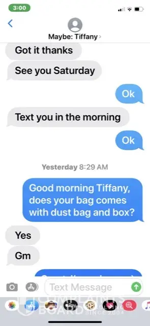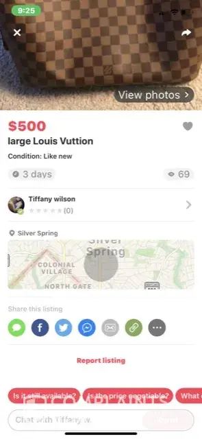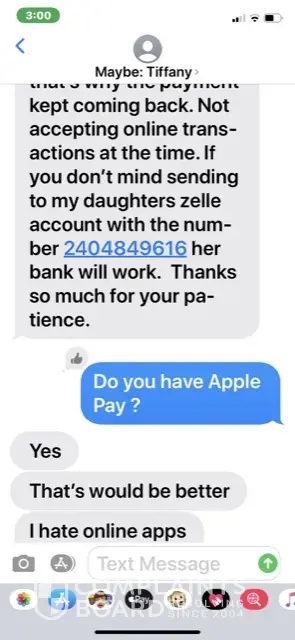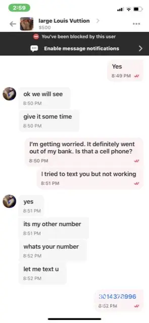 I tried to buy Louis Vuitton from Tiffany Wilson. She said she is out of town until Saturday morning. In order for her to hold it for me, I need to give her deposit of $50. She said she will meet me at Louis Vuitton store to make sure her bag is real. I gave her $50 dollars through Apple Pay. Saturday I texted her and called her but she never responded. This is a wire fraud. You guys should do something about this. Her phone number is 202-280-9192