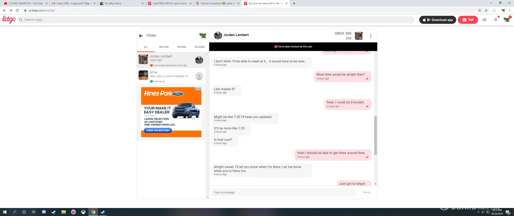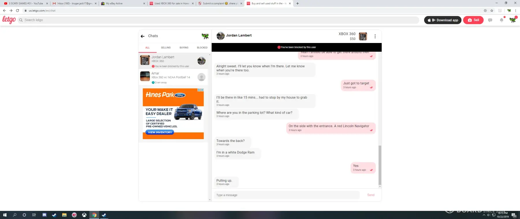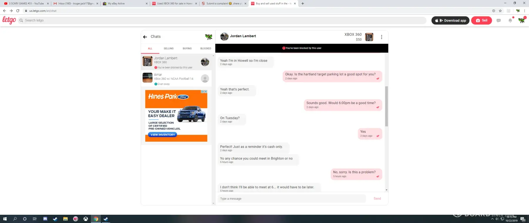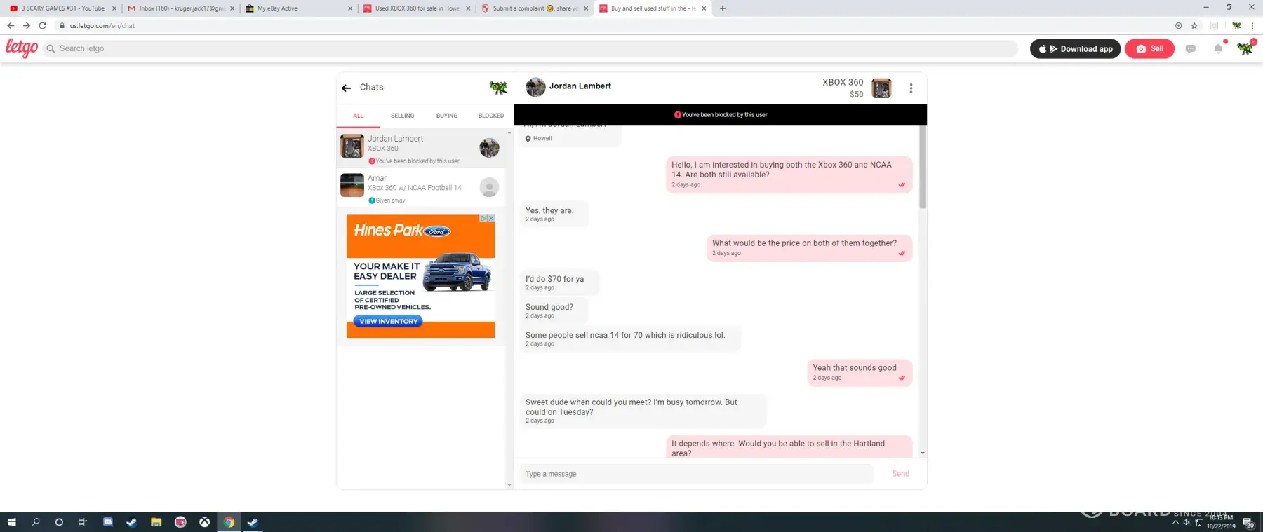 I recently bought a copy of NCAA 14 and an xbox 360 off of a seller on LetGo, but both products did not work and I would like to request a full refund. The seller name was Jordan Lambert and he lives in Howell, Michigan. We met up at our local Target on 10/22/19, and everything looked okay, but when I got to my home I tried to turn on both the Xbox and the controller, but they did not work, and when I looked at the game it was scratched so much I could not imagine what the seller had done to it. I then tried to message Jordan, but he had proceeded to block me. Again, I feel cheated and I do not feel safe using this app anymore, unless I am able to get a refund of the product.
