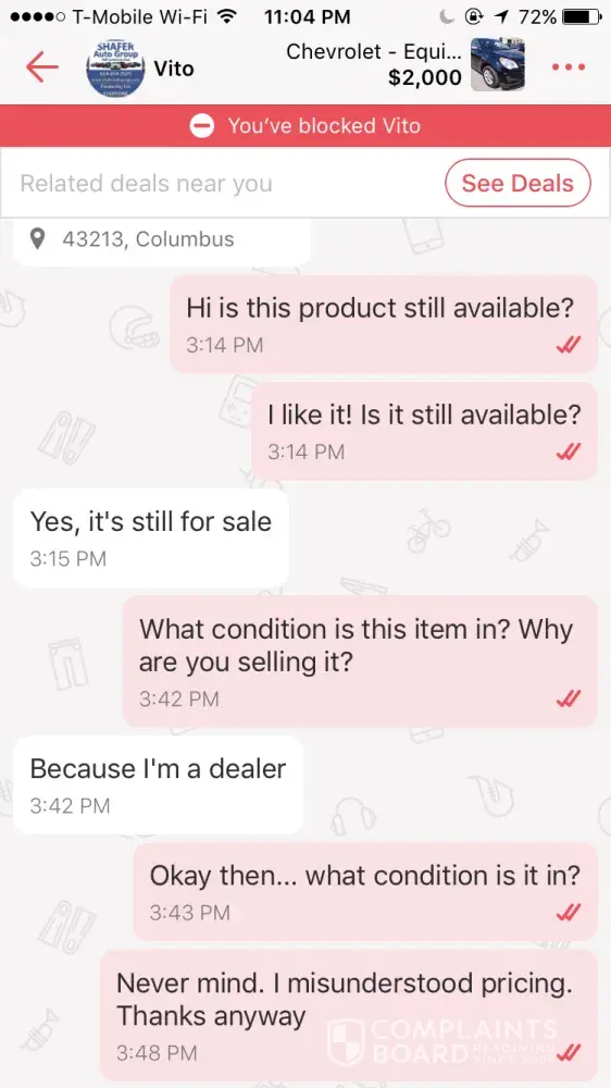 Seller listed a product as $2, 000 when the caption said is was marked down by $2, 000. His actual expected price was $15, 000+. This is very frustrating when I enter price filters and products like these show up. I use price filters for a reason. I asked why he was selling the car (already knowing he was a dealer) for $2, 000 (not realized he actually expected $15, 000+ for it) and what condition it was in. He bluntly replied, "Because I'm a dealer." And did not answer what condition the car was in.
