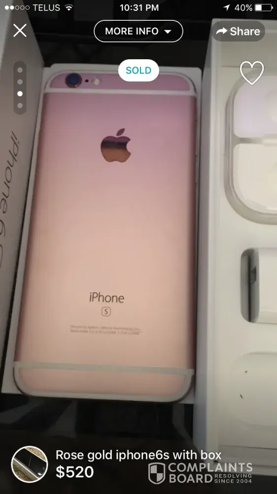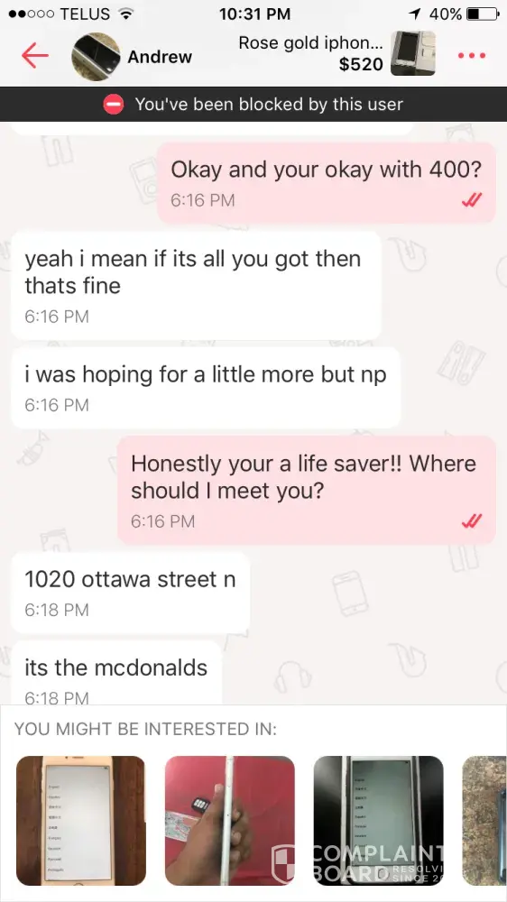 I was under the belief that I was buying a brand new iPhone 6s and was ready to pay 400$ for it. I showed up at the meeting place in Kitchener Ontario and saw the phone. Phone looked to be good and I handed over my 400$. The guy left in a hurry. I was told that the iPhone was unlocked to all companies and returned home to find that my sim did not work inside the phone. I searched the imei number to see what the status of the phone is and it is a stolen device. I am very disappointed and upset that I am now in possession of a stolen device and i think that you should give me my 400$ back... for anyone that is selling phones on your site should have to enter imei number to ensure that there is no illegal activity going on. I am very disappointed that letgo does not have security measures in place to prevent people breaking the law and having other people dragged into it. I would like you to refund me my 400$. Please find attached the images of the sellers ad. After the fact I was going to message him only to find that he had blocked me as soon as the deal was made.