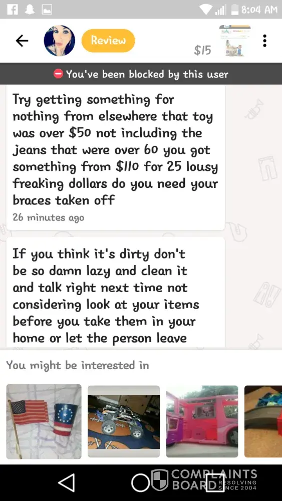 Making this quick as I can... I bought a toy table and a pair of jeans from this crackhead. She was so loud and boisterous when she got to my home at almost 10:00 at night yelling my apartment # up at the third floor and yelling up the stairs. She was obviously extremely high on somthing. I bought the items as quickly as possible to make sure no one else in the building was seeing this happen. I told her the next morning which is today that after I got done cleaning the table which was festering with spiders and roaches and roach eggs underneathand crawling live roaches ! That she was disgusting and I feel she sold her childs toys for drugs. Whether I was right (which I pretty sure I am) or not she then continued to type out a good line of threats to me mentioning my address and she will be back and how dare I say that...this is bullcrap. Its obvious you cannot judge from just a photo and text of a person. Like Craigslist you had to call and talk to the person in order to do a transaction...well this is not good and I'm considering deleting your app or you need to do something about her name is (colleen) dont know if that is spelt correctly. This is dangerous