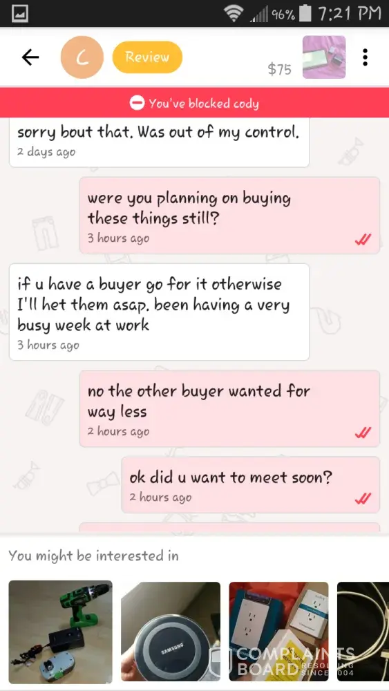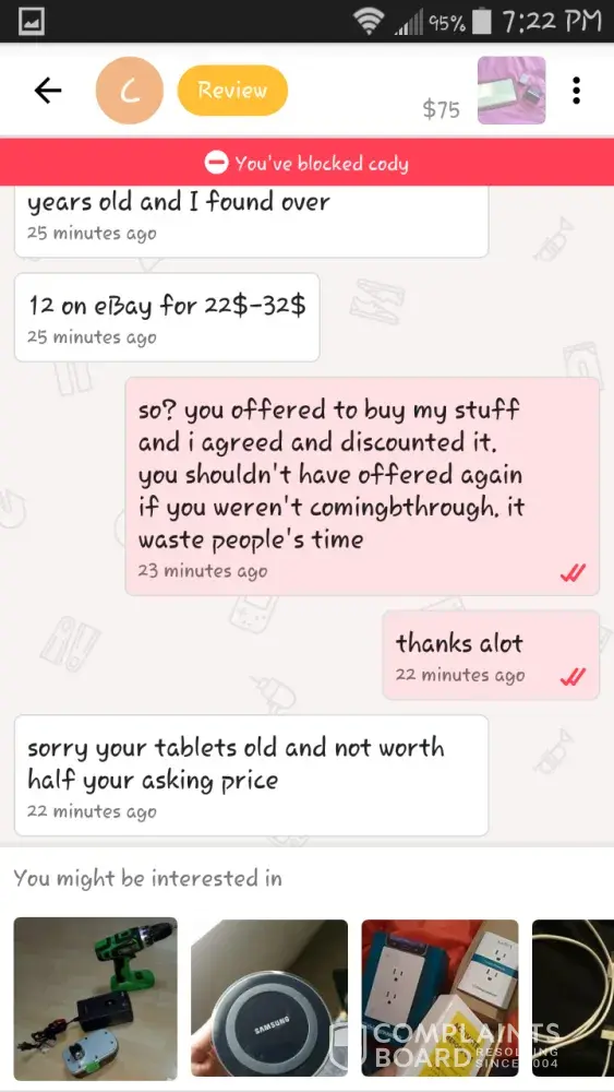 Case 2: another guy pings me on alll my items low. Selling them so bad. I tried to give him one deal but he didn't maintain the schedule.. then he again offered me on my another item, I told him to reach me only if he is ready to buy. He straight away gave me a bad review and 1 star Liebig about me in it..