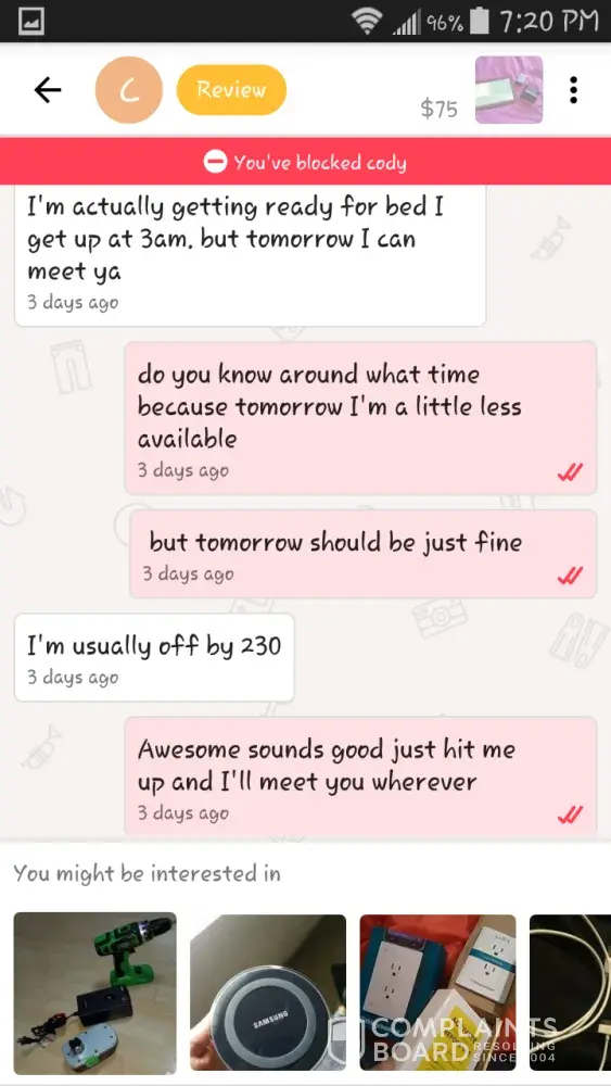 A guy offered to buy a tablet and some lights from me. Not once, but twice he said he would meet me and didn't follow through, nor did he get back to me. I was forced to send him a couple messages asking if he was going to show up or not. When he said no the second time, I called him out saying that it was wasting my time.