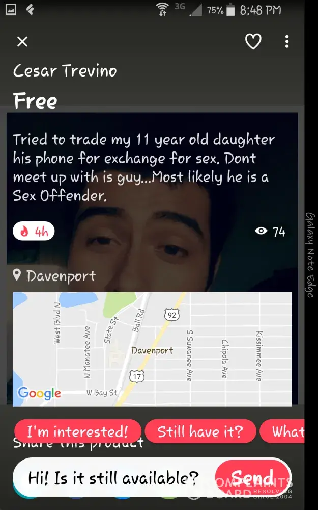 Please help someone made a fake account saying that I am sex offender or molester or whatever I need this taken down immediately this is a crime and I will need all information about them such as email and location. I'll need to report this to the police. Just search my name on the app it's Cesar Trevino. I'll waiting for a reply considering this is a serious situation which needs to be taken care of right now!