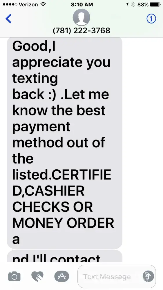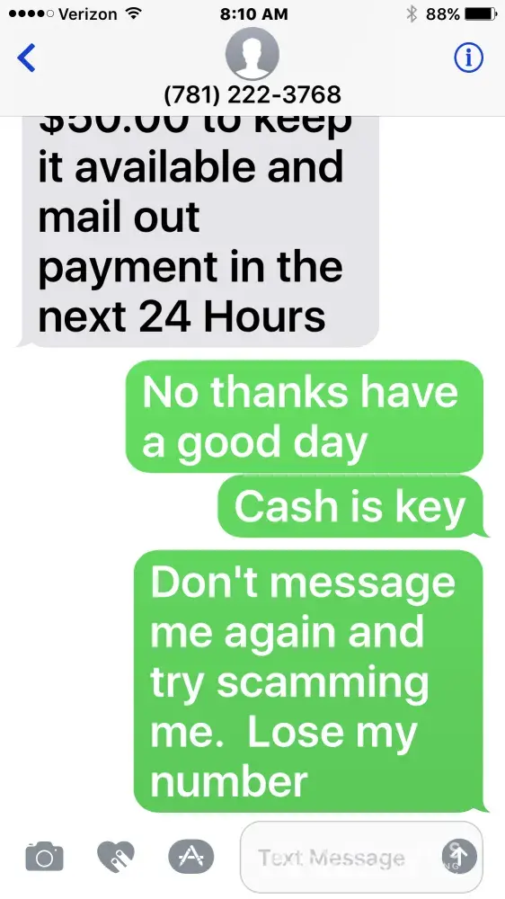 I was selling a vanity light fixture and a man or woman wanted my number to talk or text. So I gave it to him and he is trying to get people to give their names numbers and address. He is saying he will have his secretary will send a cashiers check or money order plus $50.00 to hold the item for him. I'm sure he is trying to scam people on the site and new young users may think that's how it's supposed to be done. The number he texted me from is [protected]. I don't usually complain but a person like that dicusses me. He trying to take advantage of the new young users or the old users that don't know not to give out that kind of info. That's all I'm done complaining. He's trash and should not be allowed in your site