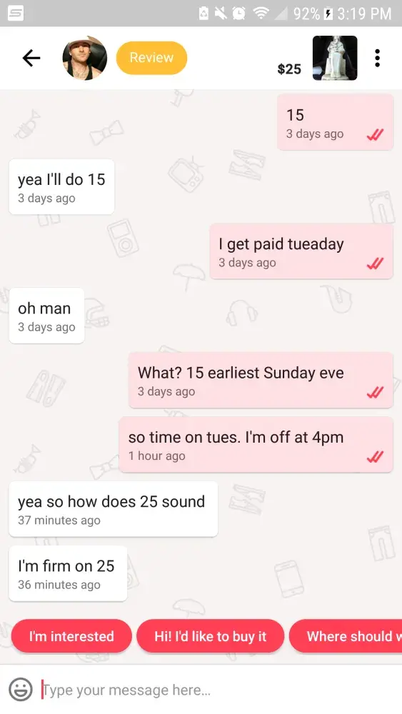 Reviews affecting my rating that are untrue multiple times the same user has rated me was one star because I would not lower my price to what they wanted it to as well as trade them so they gave me a one star review twice because I wouldn't give them what they want so it is very unfair and I believe this year is should be removed from letgo because you should not be able to for blatantly lie in regards to a situation and it be posted to a public forum it's as if the buyer is trying to manipulate you