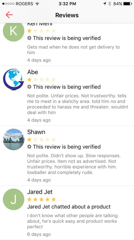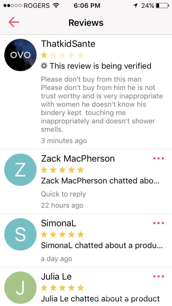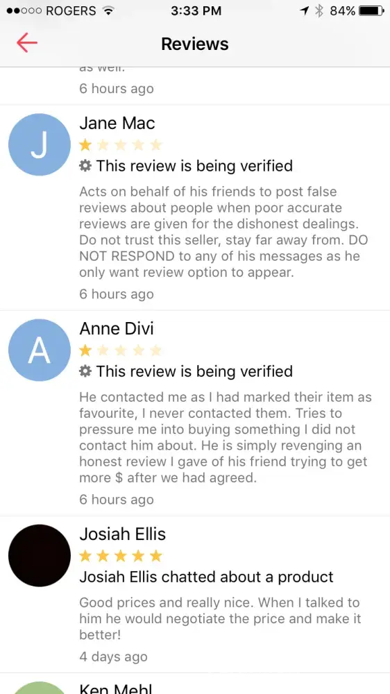 I have been giving bad reviews to people who have chatted me up about wanting to buy a product(s) Im selling. Buyers promise to meet me up but never show, chat me up about the item they really really really want and then go silent for a week or more, say that they dont have the money and are waiting for a relative to give them the money (which I politely waited a week for) which lead to nothing but silence and just simply saying Is this still available and not following through. All these people who have done this to me I have given bad reviews because of the games they like to play. One has since then gotten mad and wrote a retaliatory review because she "was on vacation" and she didnt even bother telling me that, so she just went silent like the rest. Here is the proof of the ### Im having to deal with.
