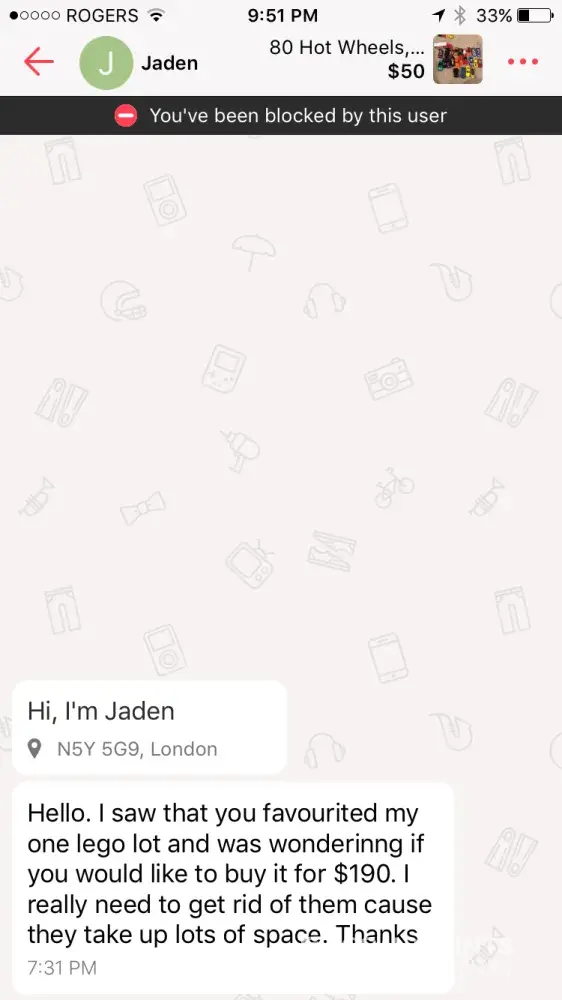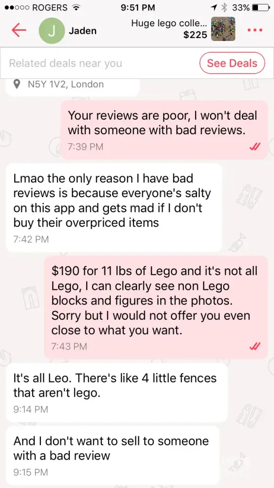 Jaden was interesting as he contacted me on one of my ads saying I had favourite his Lego ad. I found this strange. I replied using his Lego ad and turned down his offer to sell me his lot for $190, as it was too much for not being all Lego and the amount there. Also with now seeing his poor rating I also was not interested in dealing with him. I had never contacted him prior to him contacting me, only marking as favourite so I could follow the ad. He replied an hour later and then messaged a while later insulting me and then let me a review saying I never showed up and I swore and lowballed him... but I never even had any actual dealing with him. I reported his profile and blocked him but he had blocked me so I was unable to give him a review, a few hours later the review option was available and I gave a poor review of his lack of interest in my item and only wanted to give a back review based off giving his other account/friend's account a deserving 1 star ratting. jaden's profile has all negative but 1 review on him. Each negative has been marked by him for letgo to review.