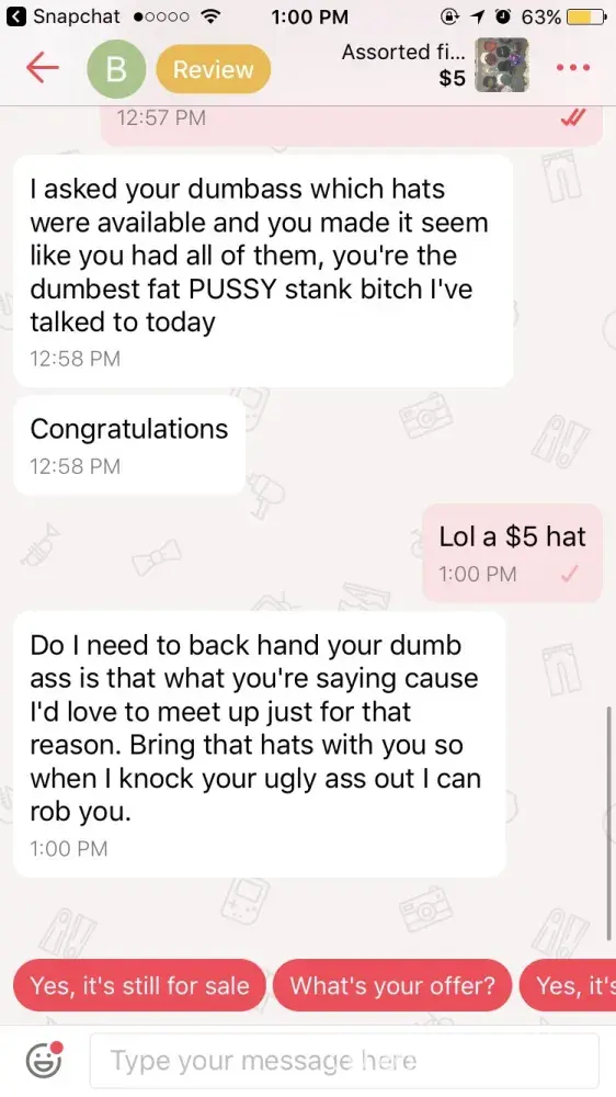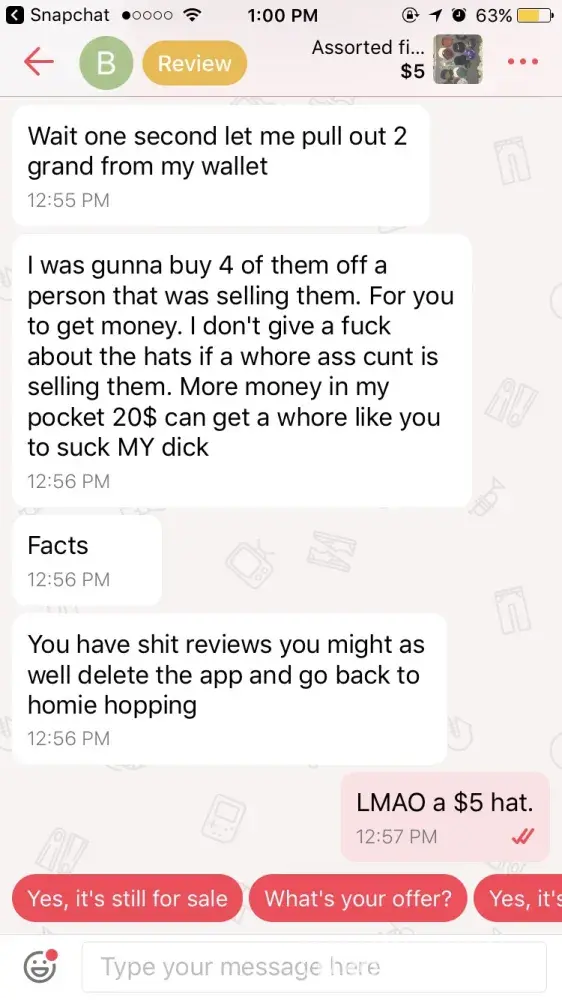 "Brandon Medina" on letgo has repeatedly insulted me, threatened to rob me, beat me, and has called me a "dumb### hoe, " "dumb b###, " "c###" all for not replying within a minute of his offer. I, at first, just didn't care but now he continues to message me and will not stop. Extremely annoying and clearly has nothing better to do than insult people on a selling app.